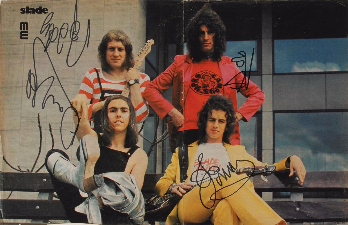 Pair of color German magazine photos of Slade, neatly taped to an overall size of 19 x 12.25, signed in black felt tip by Dave Hill, Don Powell, John Berry, and Noddy Holder, each signing first names only. In very good condition, with scattered creasing and mounting remnants to reverse. Consignor notes that these vintage signatures were obtained in person in Vienna during the early to mid-1970s.
