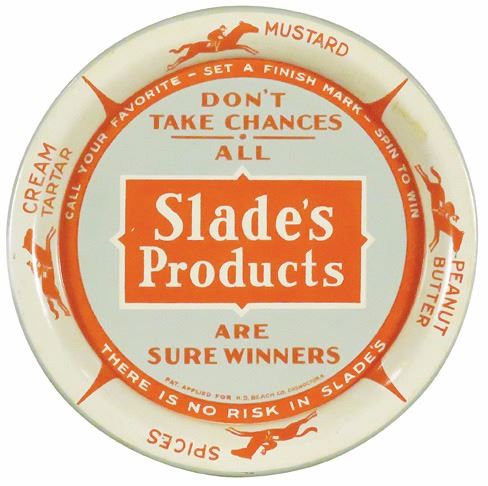 Slade's Products Tin Spinner Tip Tray. Excellent condition. 4 1/8 inch diameter.