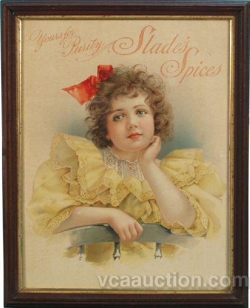 Slade's Spices Paper Advertisement "Yours For Purity" w/ girl in yellow dress in, frame - 16" x 20"