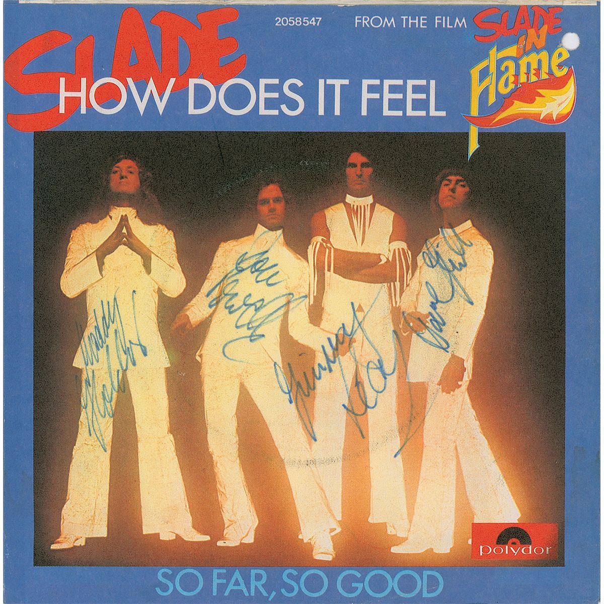 45 rpm record for ‘How Does It Feel,’ signed on the sleeve in black felt tip by Noddy Holder, Dave Hill, Don Powell, and Jim Lea. In fine condition, with expected light wear and a punch hole to top left corner.
