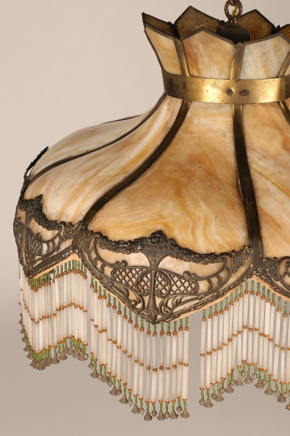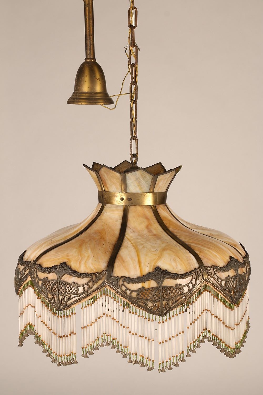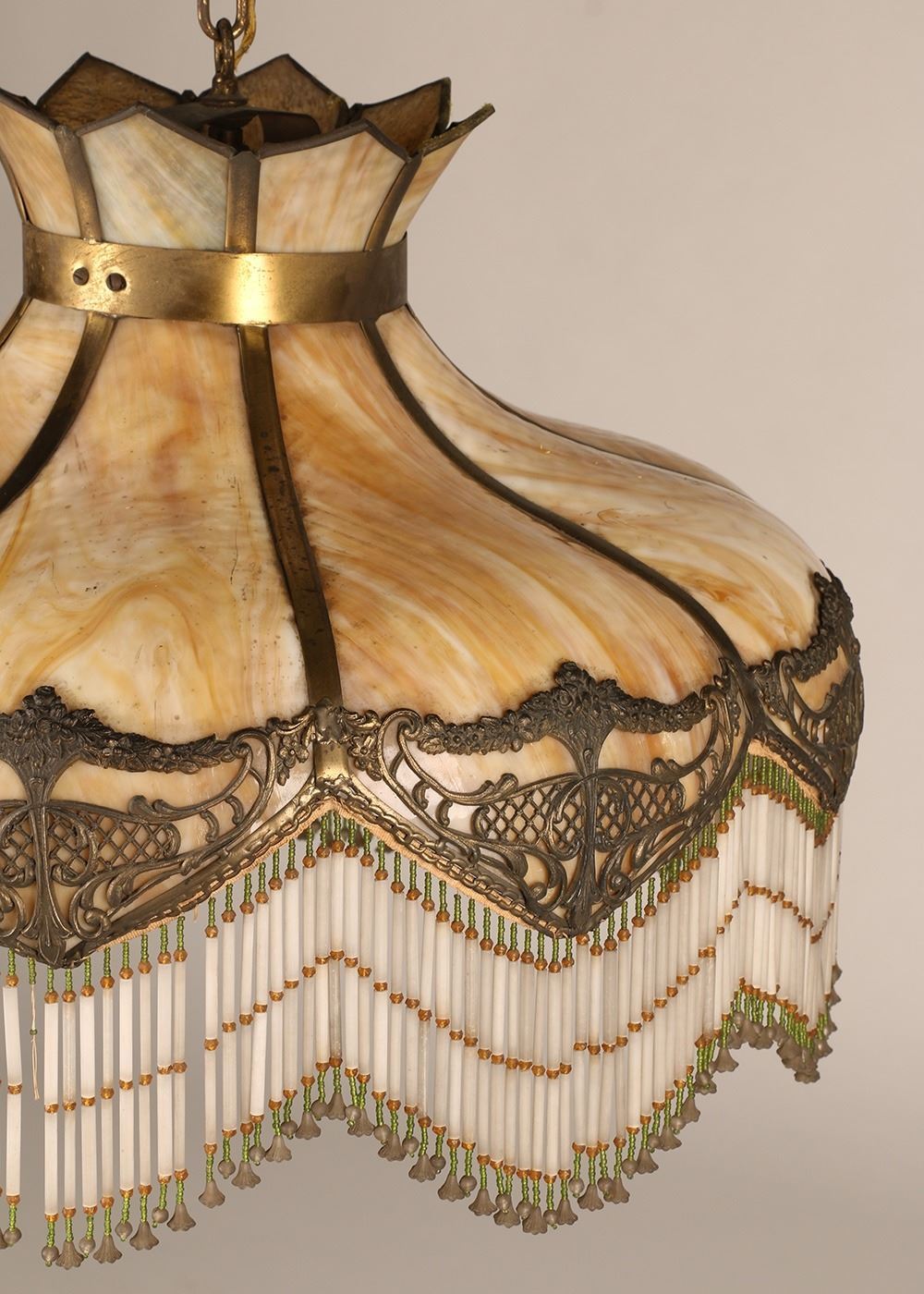 Lot 89 - Circa 1920. American. Contoured panels of caramel slag glass in brass frame. Lower edge of shade strung with beaded tassels. 22” x 17”. $400-600.