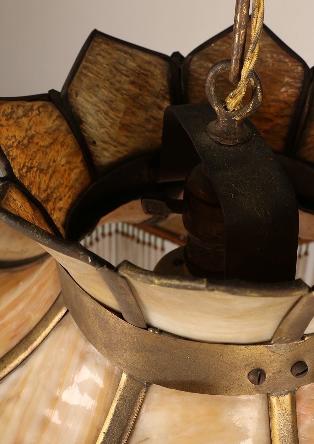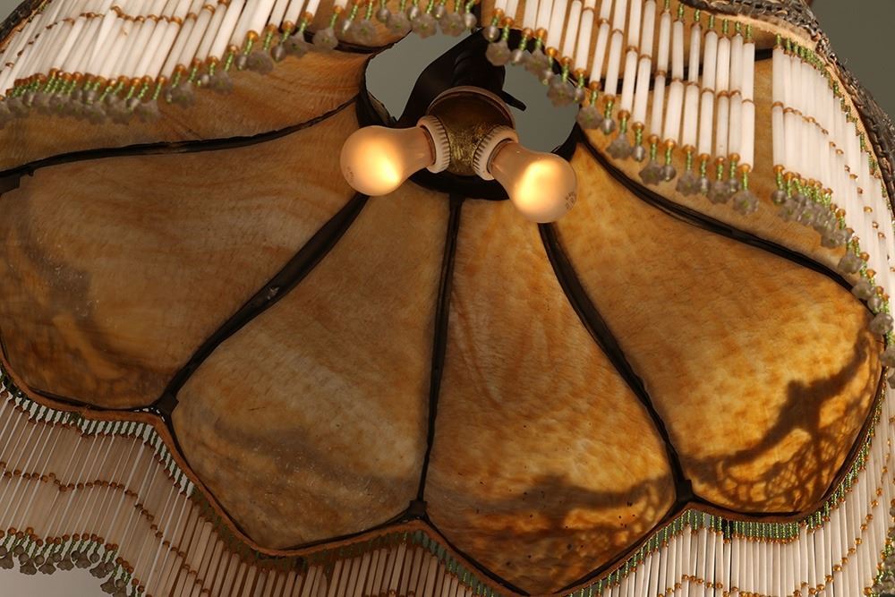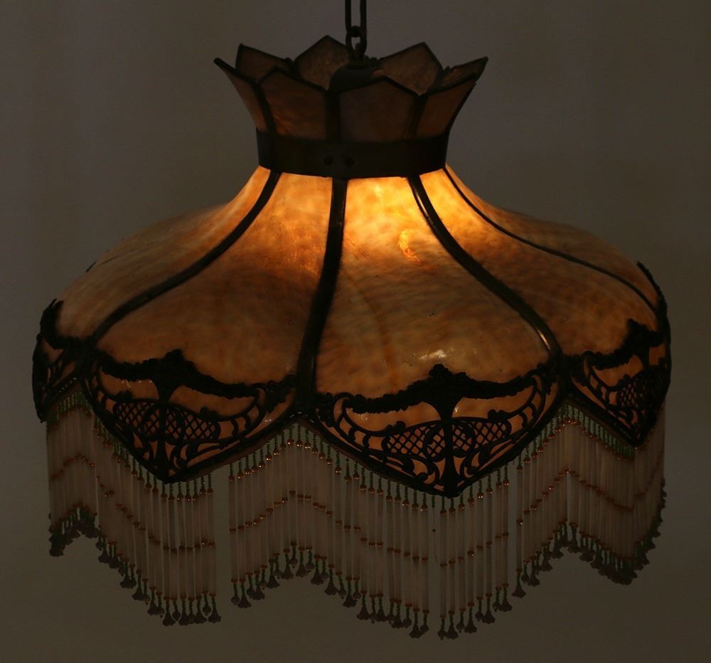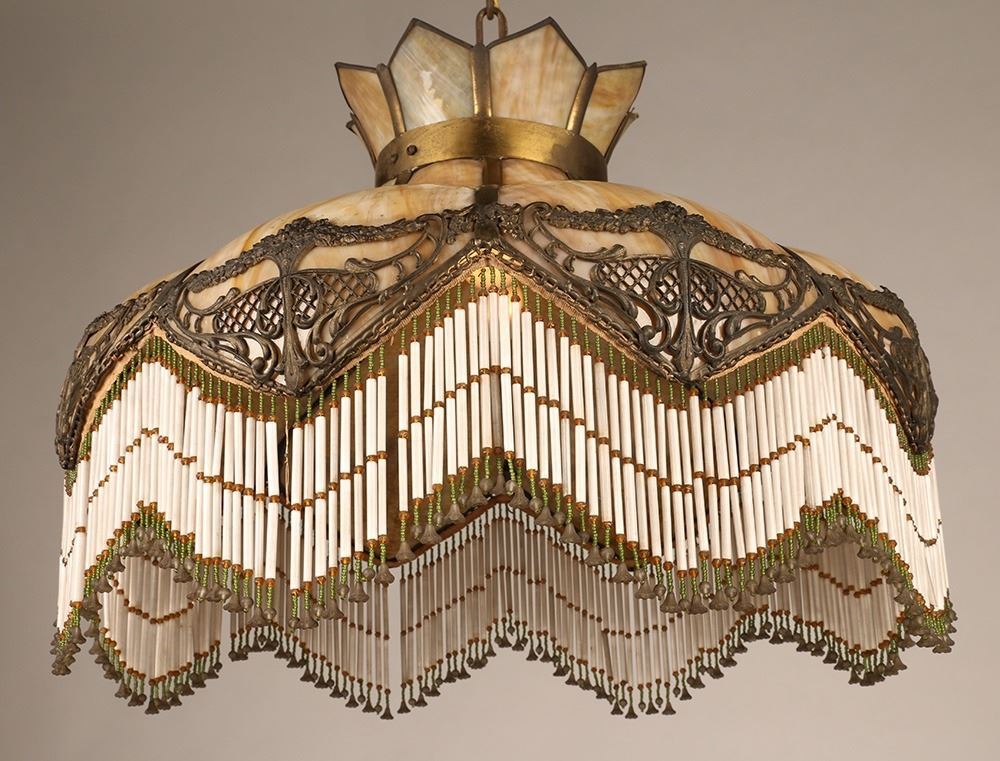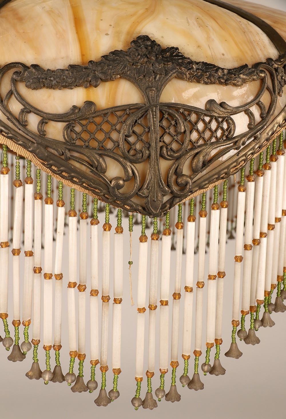 Lot 89 - Circa 1920. American. Contoured panels of caramel slag glass in brass frame. Lower edge of shade strung with beaded tassels. 22” x 17”. $400-600.