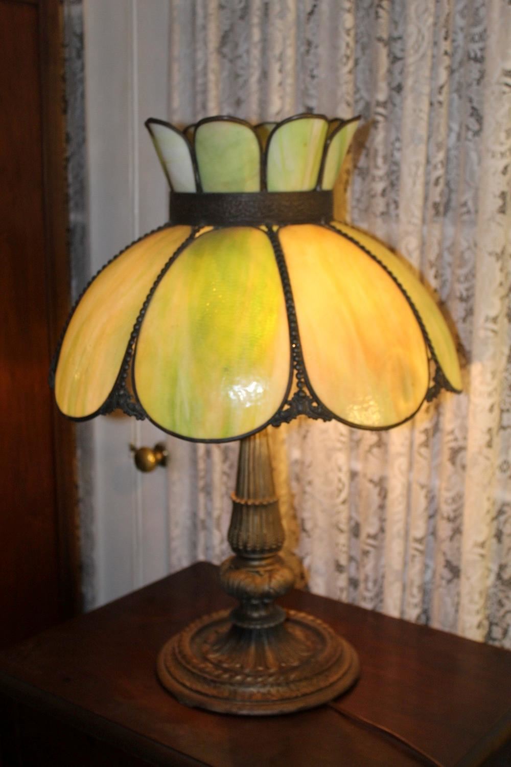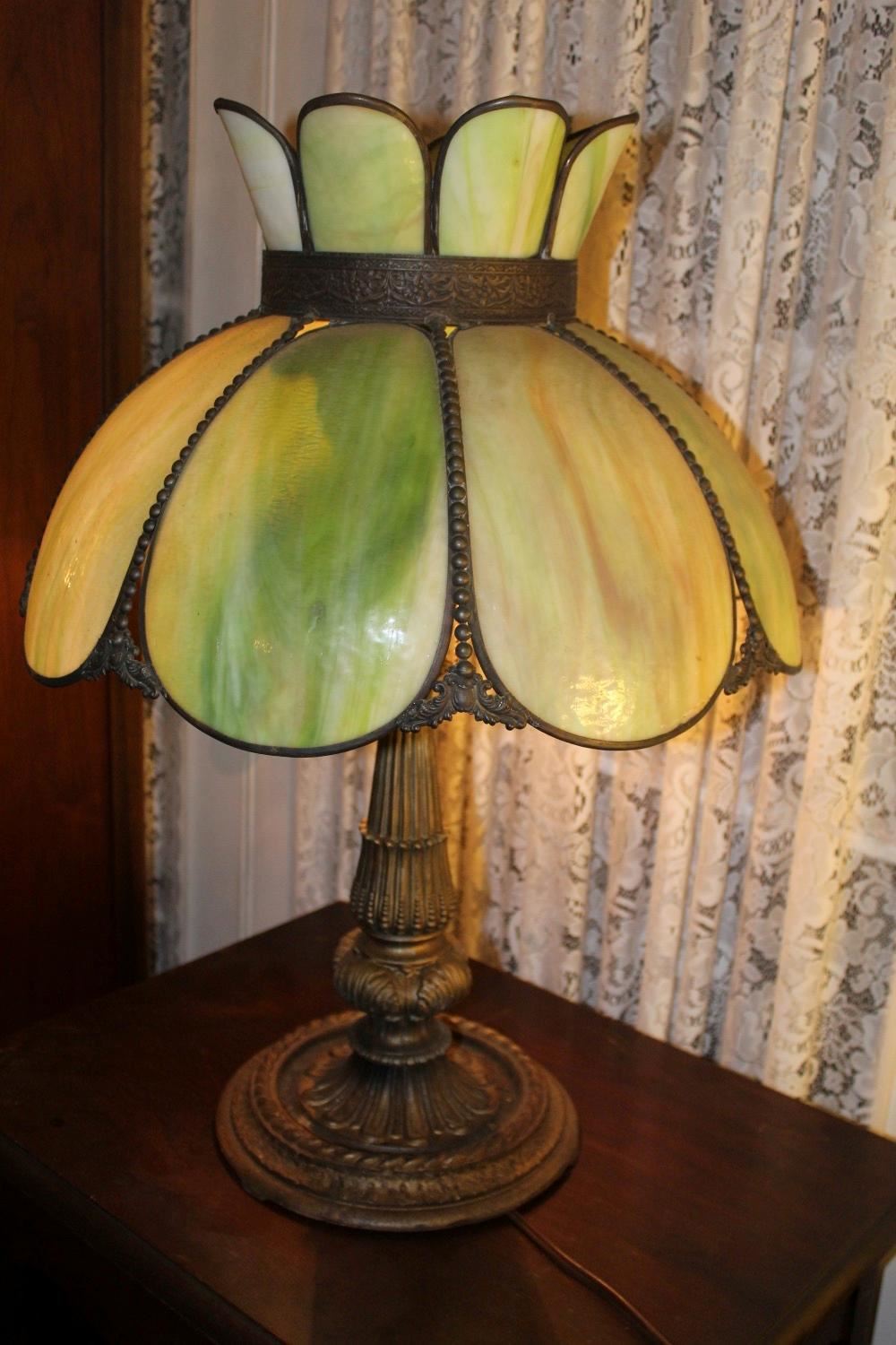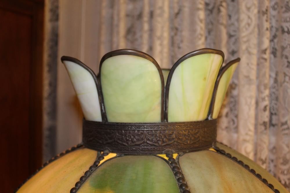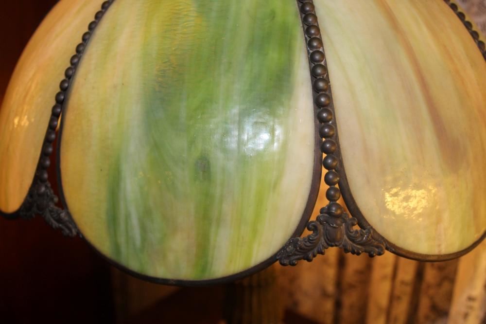 Green slag glass table glass with brass base. Measures approx. 25 inches tall x 19 inches wide