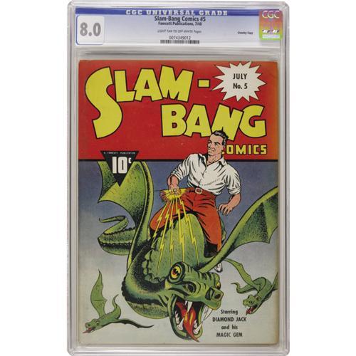 <B>Slam-Bang Comics #5 Crowley Copy pedigree (Fawcett, 1940) CGC VF 8.0 Light tan to off-white pages.</B></I> The highest graded copy in the CGC census to date, as well as the first we've had the privilege to offer. Overstreet 2006 VF 8.0 value = $475. CGC census 10/06: 1 in 8.0, none higher.<BR><BR><b>Shipping:</b> Slabbed Comic (<a target="_blank" href="http://www.heritageauctions.com/common/shipping.php">view shipping information</a>)