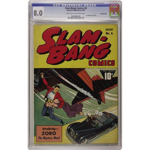 <B>Slam-Bang Comics #6 Crowley Copy pedigree (Fawcett, 1940) CGC VF 8.0 Light tan to off-white pages.</B></I> Zoro the Mystery Man makes his first appearance. An uncommon book, this is the first copy of this issue we've ever offered. Overstreet 2006 VF 8.0 value = $475. CGC census 10/06: 2 in 8.0, 1 higher.<BR><BR><b>Shipping:</b> Slabbed Comic (<a target="_blank" href="http://www.heritageauctions.com/common/shipping.php">view shipping information</a>)