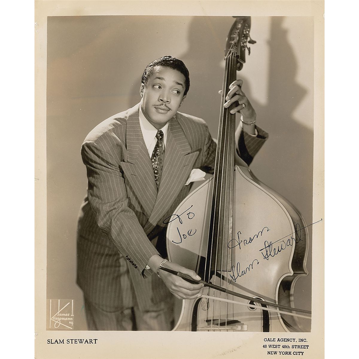 Innovative jazz bass player (1914–1987). Vintage glossy 8 x 10 publicity photo of Stewart bowing his bass, signed and inscribed in fountain pen, “To Joe, from Slam Stewart.” Binder dings to left edge and a few slight creases, otherwise fine condition.