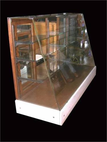 Slant front showcase, marble base, 6 glass shelves, 50 inches tall, 6 foot long. Good Cond.