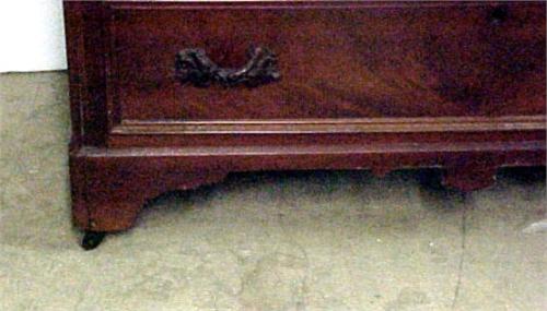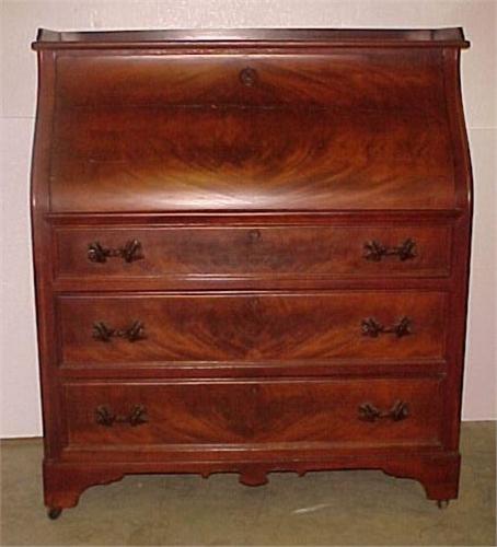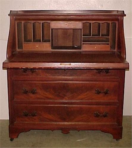 Slant front walnut desk; rectangular top with small gallery over curved slant front; which open to expose interior pigeonholes; over three graduated long drawers (metal drawer pulls); bracket feet on casters; 19th C.; approximately 4' 1" high x 3' 6" acro. WILL NOT SHIP.