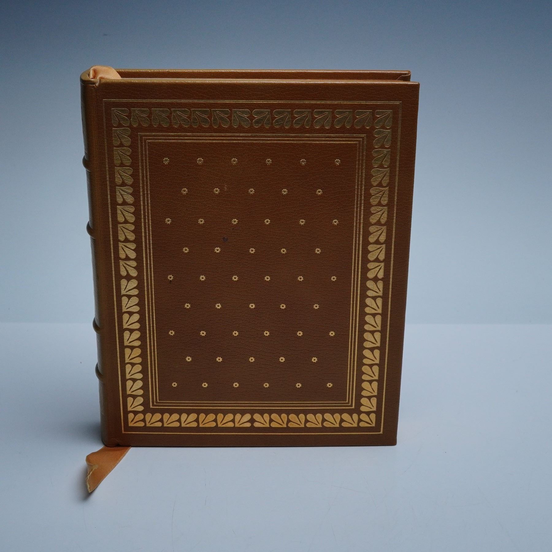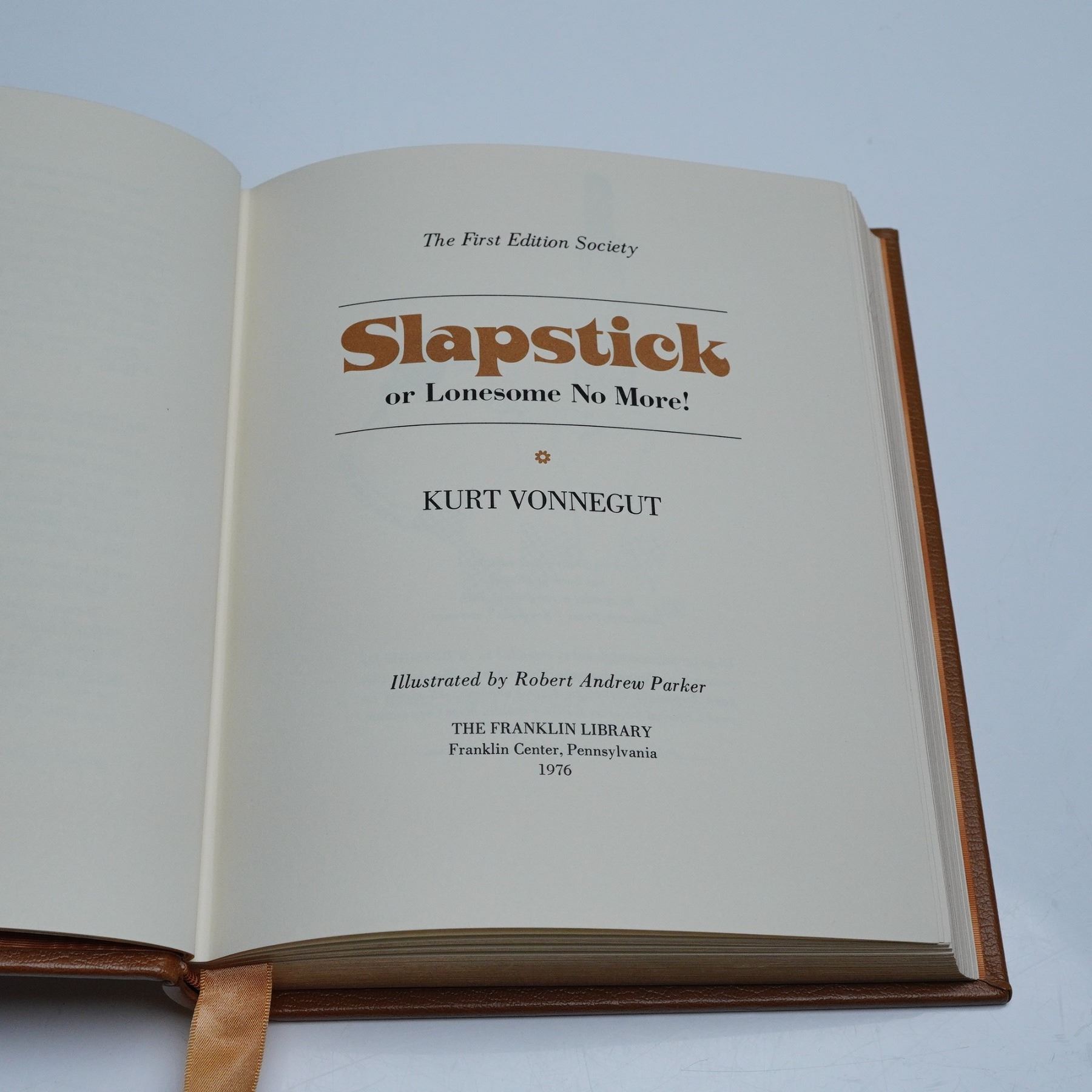 A fine leather-bound first edition of Slapstick or Lonesome No More by Kurt Vonnegut, published by The Franklin Library for the First Edition Society, 1976. Bound in full brown leather with elaborate gilt decoration to the boards and spine, all edges gilt, and a satin ribbon marker. Illustrated by Robert Andrew Parker. This collectible edition features archival-quality paper and is a beautifully preserved example of Franklin Library craftsmanship, suitable for any serious Vonnegut collector. Measures 6.75"L x 1.25"W x 8.25"H.