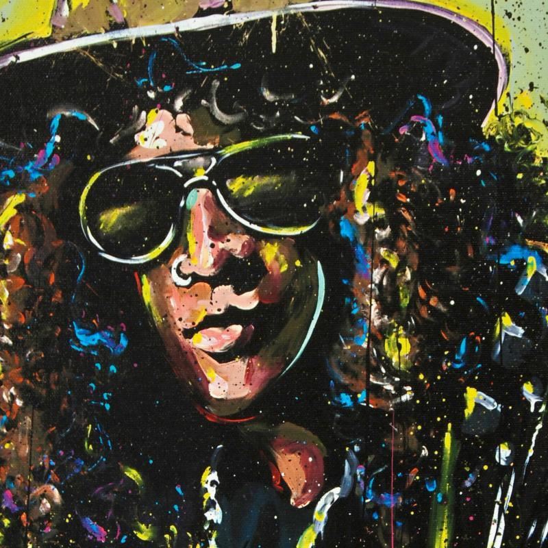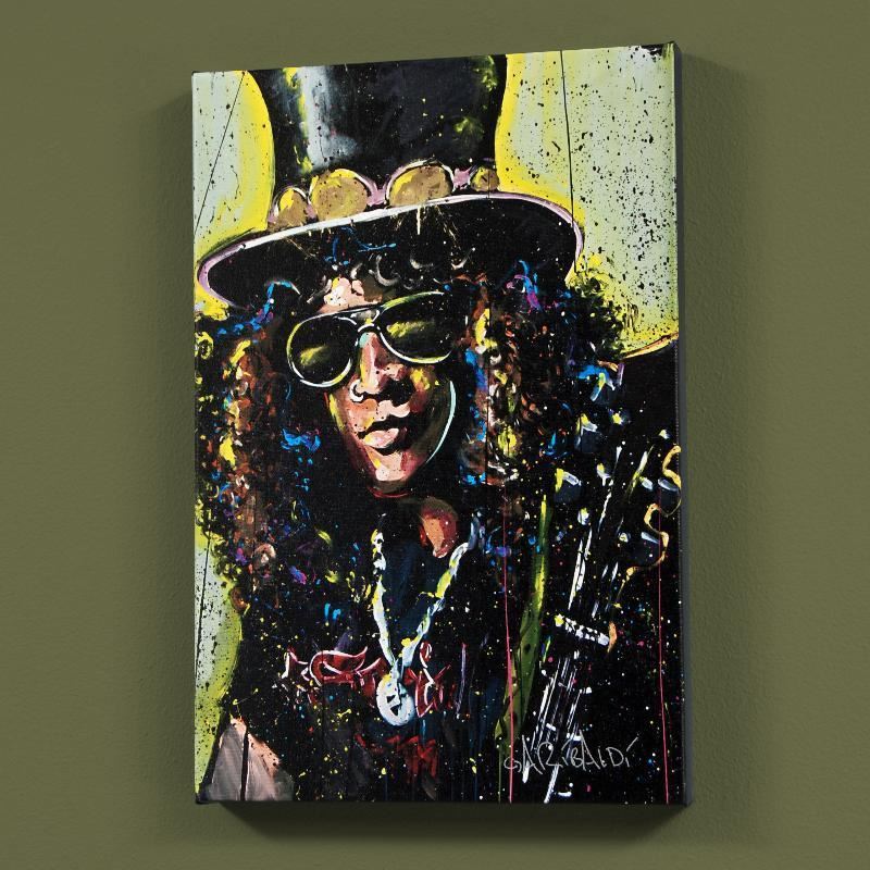 Combining his passions for music and art, David Garibaldi creates stunning visual poetry. "Slash" is a limited edition giclee on stretched canvas, numbered from the miniature series and bearing the artist's authorized signature. This piece comes gallery wrapped. Includes Certificate of Authenticity! Measures approx. 12" x 18" (image).