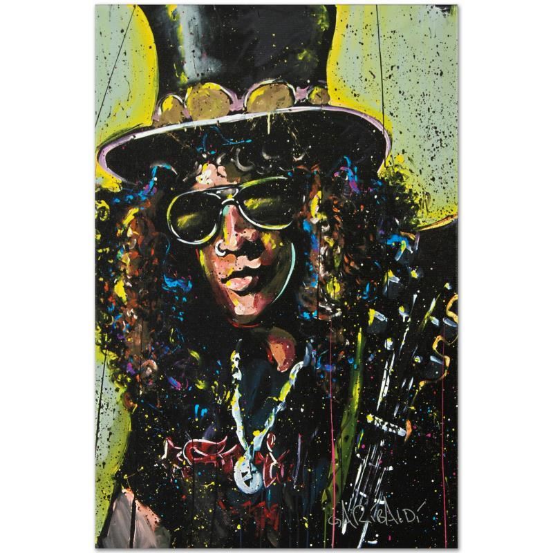 Combining his passions for music and art, David Garibaldi creates stunning visual poetry. "Slash" is a limited edition giclee on stretched canvas, numbered from the miniature series and bearing the artist's authorized signature. This piece comes gallery wrapped. Includes Letter of Authenticity. Measures approx. 12" x 18" (image).