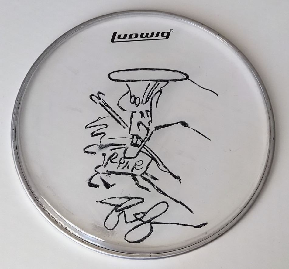 A ludwig 12 inch drumskin head with self portrait signed by Slash. Supplied with coa.