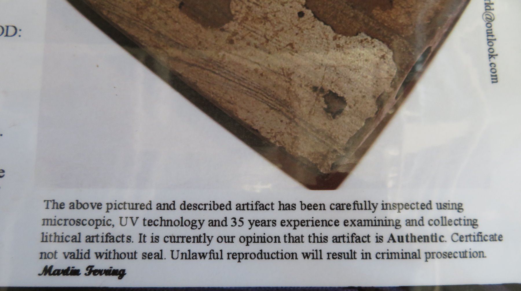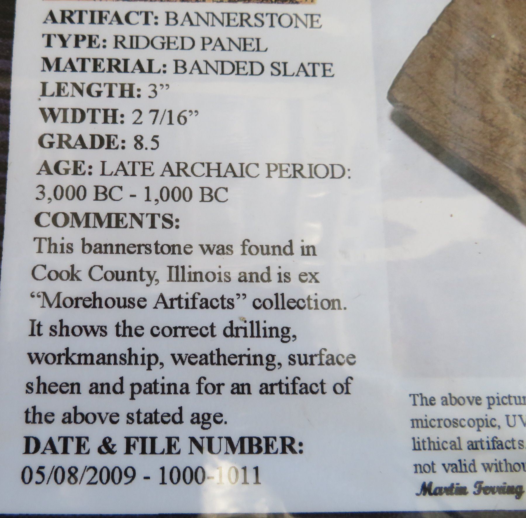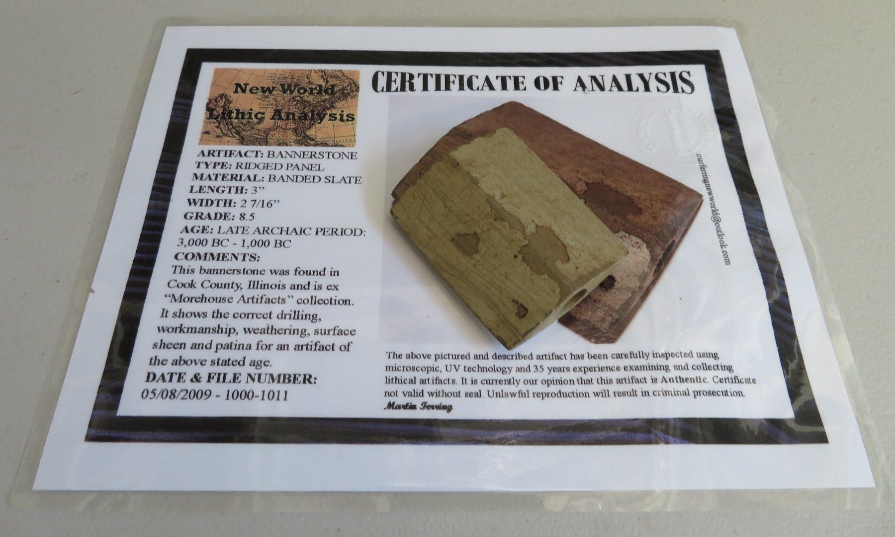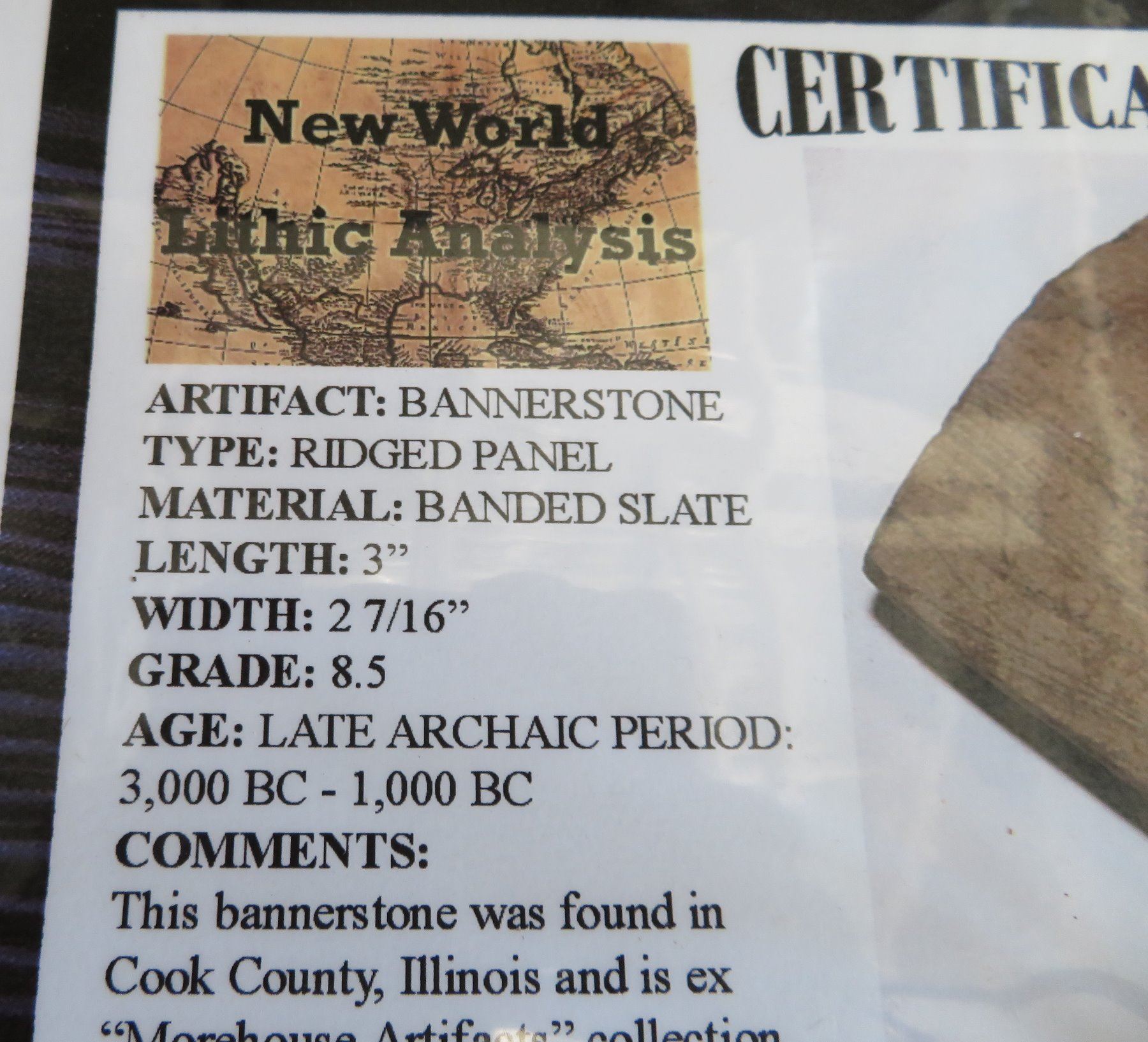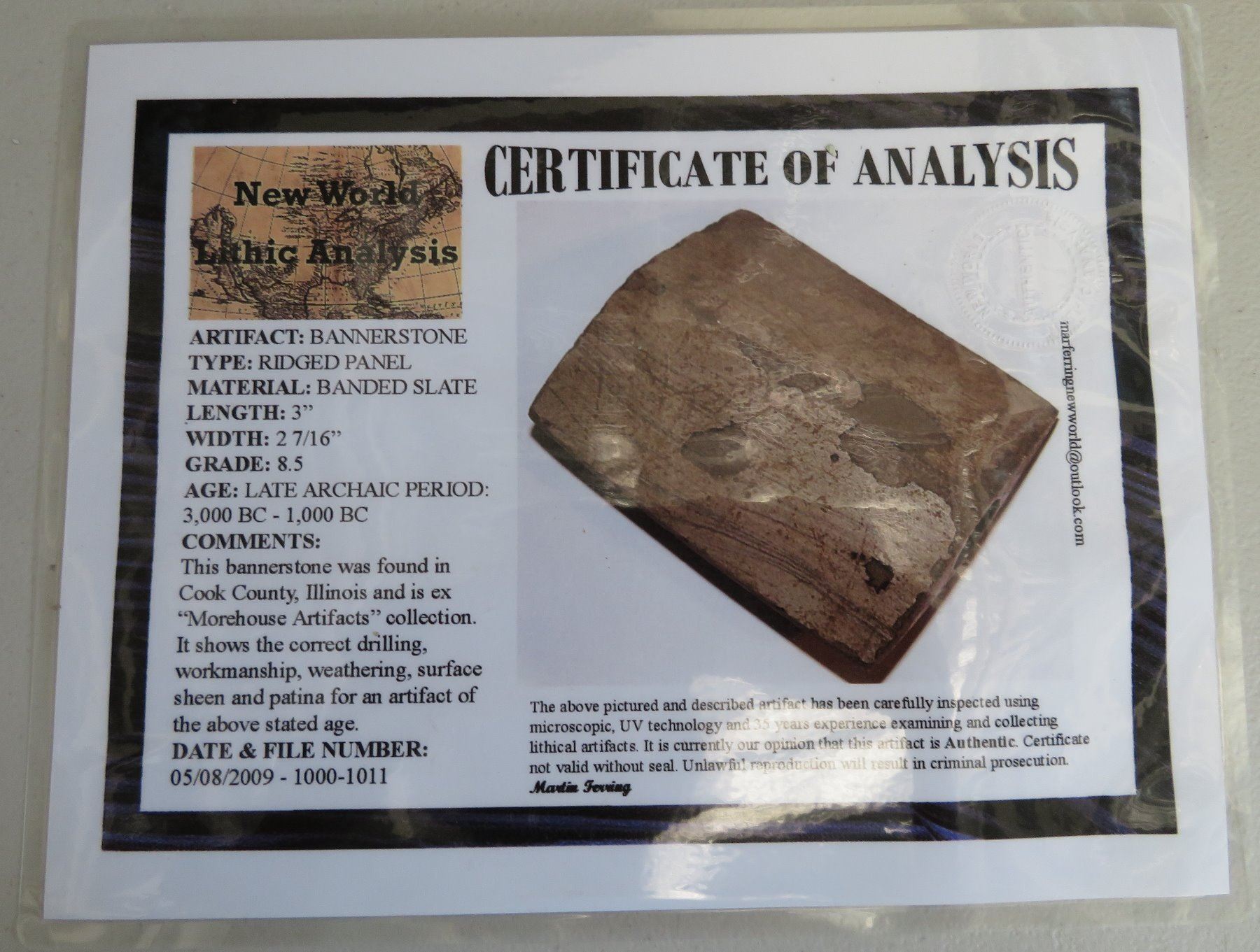 Slate Bannerstone w/COA, c. 2000 years old. Made of slate, the item measures 3" x 2 1/2". Cook County, Illinois. Certificate of Authenticity. Condition: Good, see images. Shipping: $24.50 w/insurance and signature.