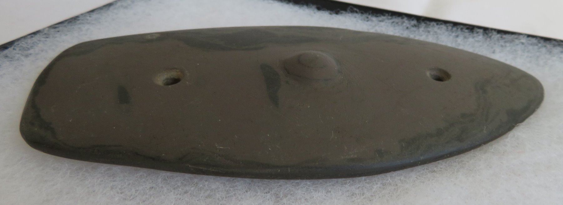 Slate Humpback Gorget w/Helm COA, Hopewell era. Made of banded slate, the item measures 4 3/4" x 2 1/4". Randolph County, Indiana. Helm Certificate of Authenticity. Condition: Good, see images. Shipping: $25.50 w/insurance and signature.