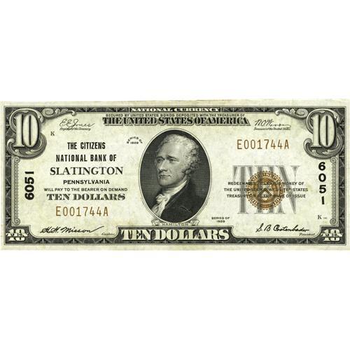 <B>Slatington, PA</B></I> - $10 1929 Ty. 1 <B>The Citizens NB</B></I> Ch. # 6051<BR>Nice margins and traces of embossing are observed on this <B>Choice About Uncirculated</B></I> $10. A couple of pinholes are also noticed.