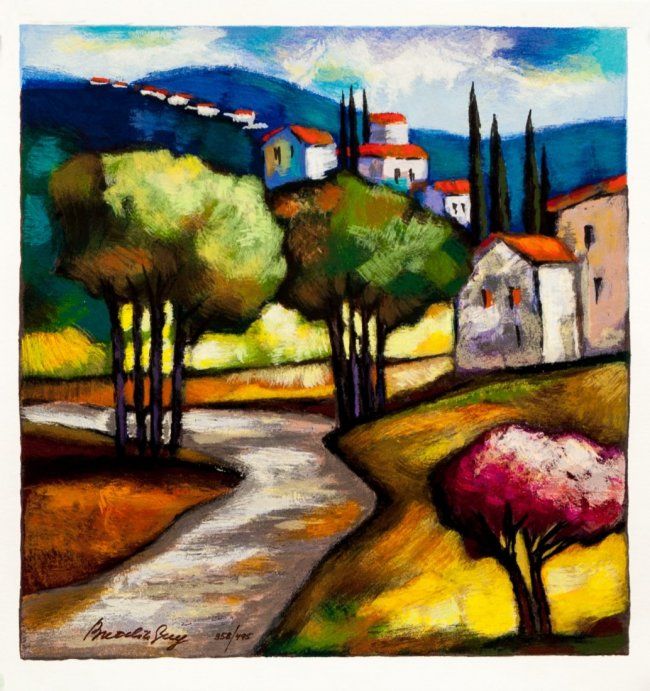 Slava Brodinsky "A Walk in the Village" Limited Edition Serigraph on Paper. Size: 13.25" x 13.75" Hand signed by the artist and numbered. Comes with COA and unframed W1201