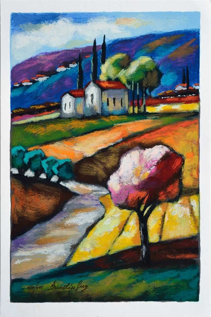 Artist: Slava Brodinsky - Title: Homestead Charm - Medium: Serigraph on Fine Art Paper - Signature: Hand-signed by the Artist - Limited Edition: 495 - Image Size: Approximately 12.5 inches x 9 inches - Paper Size: Approximately 13.5 inches x 10 inches - Framed: Unframed - Details: This work comes with a Certificate of Authenticity - Biography:Slava Brodinsky Is A Master Of Painting The Light, Capturing The Rays Of The Sun In His Landscapes. His Work Is Textured And Has An Air Of Earthiness, Achieved By The Use Of Rough Brushes, Impasto And Mixing The Paint With Natural Elements Such As Sand.
