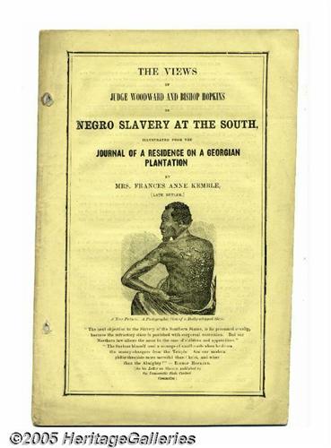 <B>Slavery Through a Northern Woman's Eyes... a Rare Imprint</B></I> A 32-page pamphlet in yellow, pictorial wraps entitled "The Views of Judge Woodward and Bishop Hopkins on Negro Slavery at the South, Illustrated from the Journal of a Residence on a Georgian Plantation by Mrs. Frances Anne Kemble, (late Butler)." The pamphlet includes extracts taken from a diary, written as letters, kept during the winter and spring of 1838-1839, on a rice and cotton plantation on the coast of Georgia. The writer, Frances Kemble, paints a remarkable picture of slave life, evoking the horror and suffering, especially by slave women. Two minor holes in margin otherwise fine. A rare, important work. Lot:250