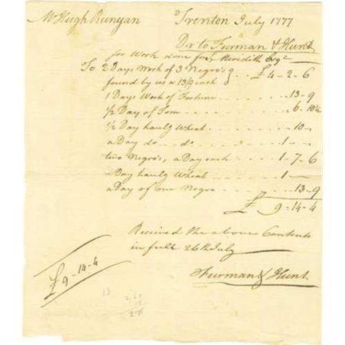 <B>(Slavery in the American Revolution) Fine Content Manuscript Document Signed "</B></I><B><I>Furman & Hunt</B></I></B></I><B>".</B></I> One page, 6" x 7", Trenton, New Jersey , July 1777, being an invoice directed to Hugh Runyan for slaves he had rented for work from the firm of Furman & Hunt, "<I>for Work don for L. Meredith Esqr.</B></I>" for the sum of £9-14-4 which included "<I>To 2 Days Work of 3 Negro's found by us at 13/9 each...1 Days Work of Fortune...1/2 Day of Tom...two Negro's , a Day each...a Day of one Negro...</B></I>" The practice of "hiring" or "renting" slaves was quite common in America during the eighteenth century. Idle slaves during the period between seasonal plantings and chores were often hired out by their owners for odd jobs, thus making them a more profitable investment. Light creases with minor pinholes at intersections, else fine. <I>Ex. Henry E. Luhrs Collection.</B></I><BR><BR><BR><b>Shipping:</b> Flat Material, Small (<a target="_blank" href="http://www.heritageauctions.com/common/shipping.php">view shipping information</a>)