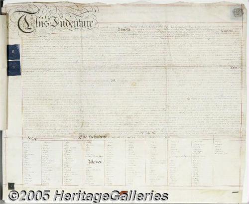 <B>Slavery in the Caribbean</B></I> A large and ornate manuscript document measuring 28.5" x 23.5" on vellum with a smaller attached page, Glasgow, December 18, 1804, a deed in which James Muir of Glasgow sells a 165 acre sugar plantation on St. Vincent (known as, "Monkton's Land" to Edmund Fleming Akers of London for 2,260 pounds . The deed, in addition to describing the land in detail, lists the other articles of "property" which included 179 slaves -- sixty-three men, seventy-two women, fifteen boys and nineteen girls. Each is listed by their name in alphabetical order and divided by gender. Names include a variety of typical appellations of the day that typify paternalistic impulses of plantation owners and their ability to dehumanize their charges: "Fido", "Ceaser", and "Pet". Other slaves were named by their occupation including "Boatswiain". Others are identified by their complexion with names like "Yellow John". Other names include "Laurent", "Jan England", "Munday", "Dick Mason", and "Franco". Light, damp-stains, usual folds, otherwise very clean and bright. An excellent example from a dark period in history. <I>From the collection of Bradley O'Leary.</B></I>