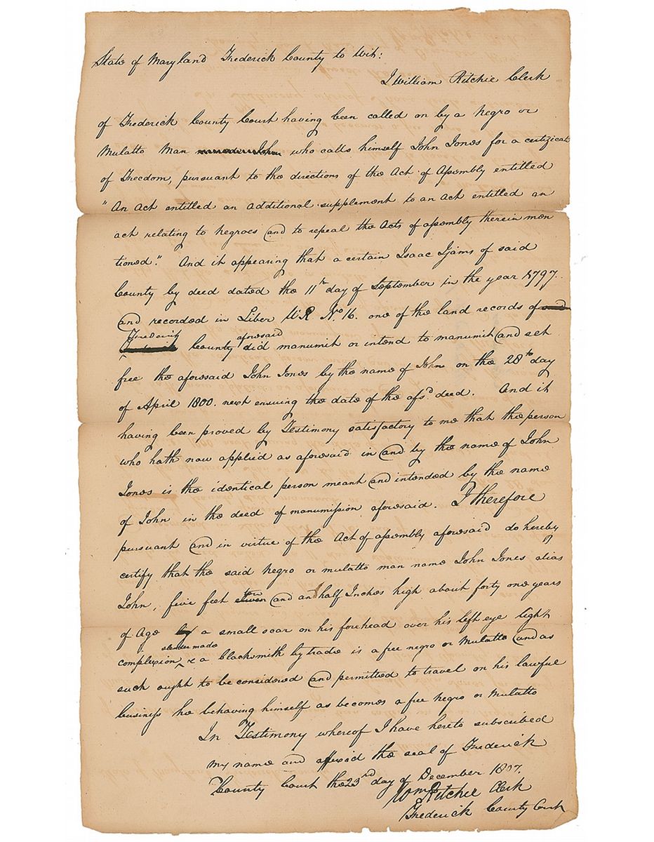 ADS, signed “Wm. Ritchie, Clerk, Frederick County Court,” one page, December 23, 1807. Legal affidavit granting John Jones his freedom reads, in part: “I William Ritchie…having been called on by a Negro or Mulatto Man who calls himself John Jones for a certificate of Freedom…and it appearing that a certain Isaac Ijams…by deed dated the 11th day of September in the year 1797…did manumit or intend to manumit and set free the aforesaid John Jones on the 28th day of April 1800…and it having been proved by Testimony satisfactory to me that the person who hath now applied as aforesaid…is the identical person meant and intended…in the deed of manumission aforesaid. I therefore…certify that the said Negro or Mulatto man named John Jones…a blacksmith by trade is a free Negro or Mulatto and as such ought to be considered and permitted to travel on his lawful business he behaving himself as becomes a free Negro or Mulatto.” In very good to fine condition, with small separations along fragile horizontal folds, scattered toning, and some mirroring of ink from folding. These types of documents are quite scarce and not readily available at auction.