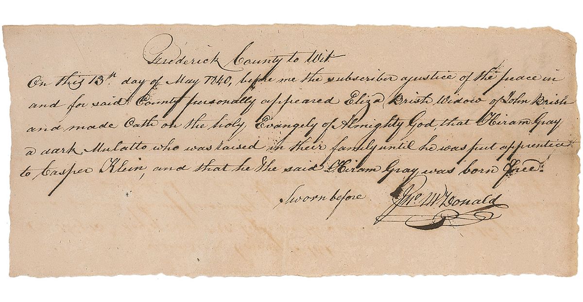 Manuscript document, one page, 8 x 3.5, May 13, 1840. Slavery-related document confirming a man’s freedom. In full: “Frederick County to wit: On this 13th day of May 1840, before me the subscriber a justice of the peace and for said County personally appeared Eliza Brish Widow of John Brish and made Oath on the holy Evangely of Almighty God, that Hiram Gray a dark Mulatto who was raised in their family until he was put apprentice to Casper Klein, and that the said Hiram Gray was born free. Sworn before Jno. McDonald.” In fine condition, with central vertical and horizontal folds.