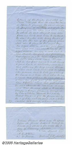 <B>Slaves in Trade for Cotton 1852 Anderson County, Texas, Manuscript Document</B></I> January 2, 1852, lending of four slaves, Anderson County, Texas. Extremely fine. Manuscript document pale blue, lined paper, trimmed to 12" x 7.5", 1 and 1/3 pages. An agreement stating John Hassell will give four of his slaves, along with necessary farming tools, to John Nutt, an overseer of his small plantation. Upon receiving the slaves, Nutt will use them for harvesting a cotton crop, where he would not normally be able to. In return, Hassell will receive 4/5 of the crop. Being that slave owners in the south had around ten slaves, it was not uncommon for such a transaction, being that both parties benefited from the agreement. Still, this type of exchange was rarely written down, making this particular document all the more rare. A few tear marks and simple creases on top of paper. Two small slices have been made in paper originally for filing. Lot:251