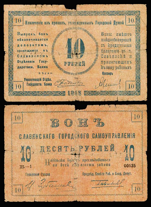 Slaviansk, Russia, 1918, Good for 10 Rubles, Denis 1405, Gray-green on orange underprint with denomination counters in corners, back gray-green on orange underprint, S/N 00135, Scarce private or local scrip note.