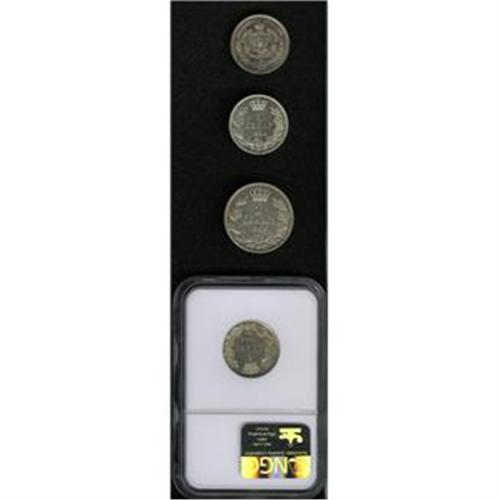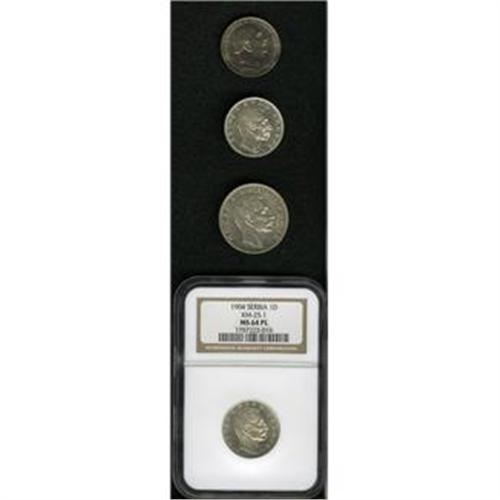 <B>Slavic Silver Selection, </B></I>Serbia Dinar 1904, two examples, cleaned XF-AU and MS64 Prooflike NGC, 2 Dinara 1904, AU, and Montenegro Perper 1912, cleaned XF, toned with some underlying luster. <B>Sold as is, no return lot.</B></I>