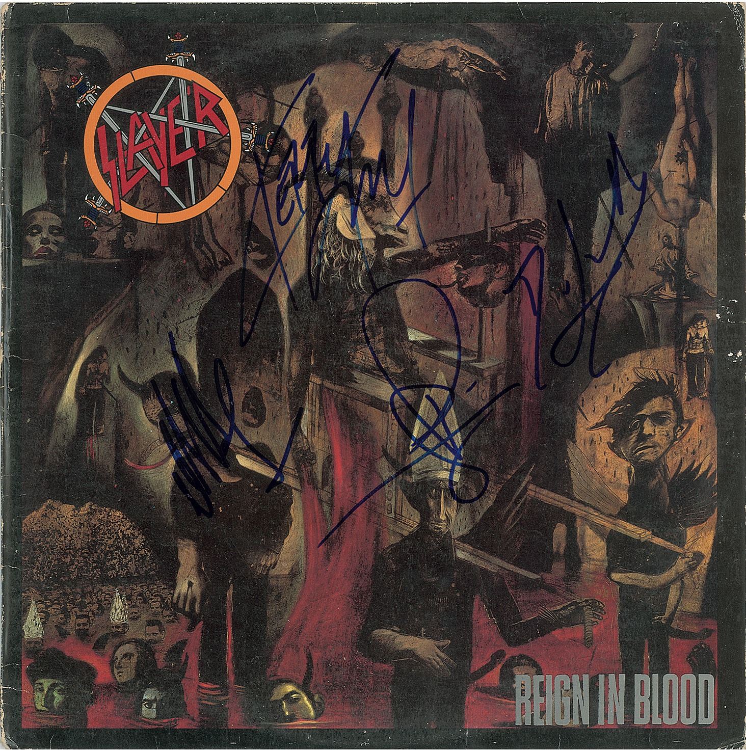 Reign in Blood album signed on the front cover in blue felt tip by Tom Araya, Kerry King, Jeff Hanneman, and Dave Lombardo. In fine condition. The record is included. A must-have thrash metal record signed by the original members of Slayer.