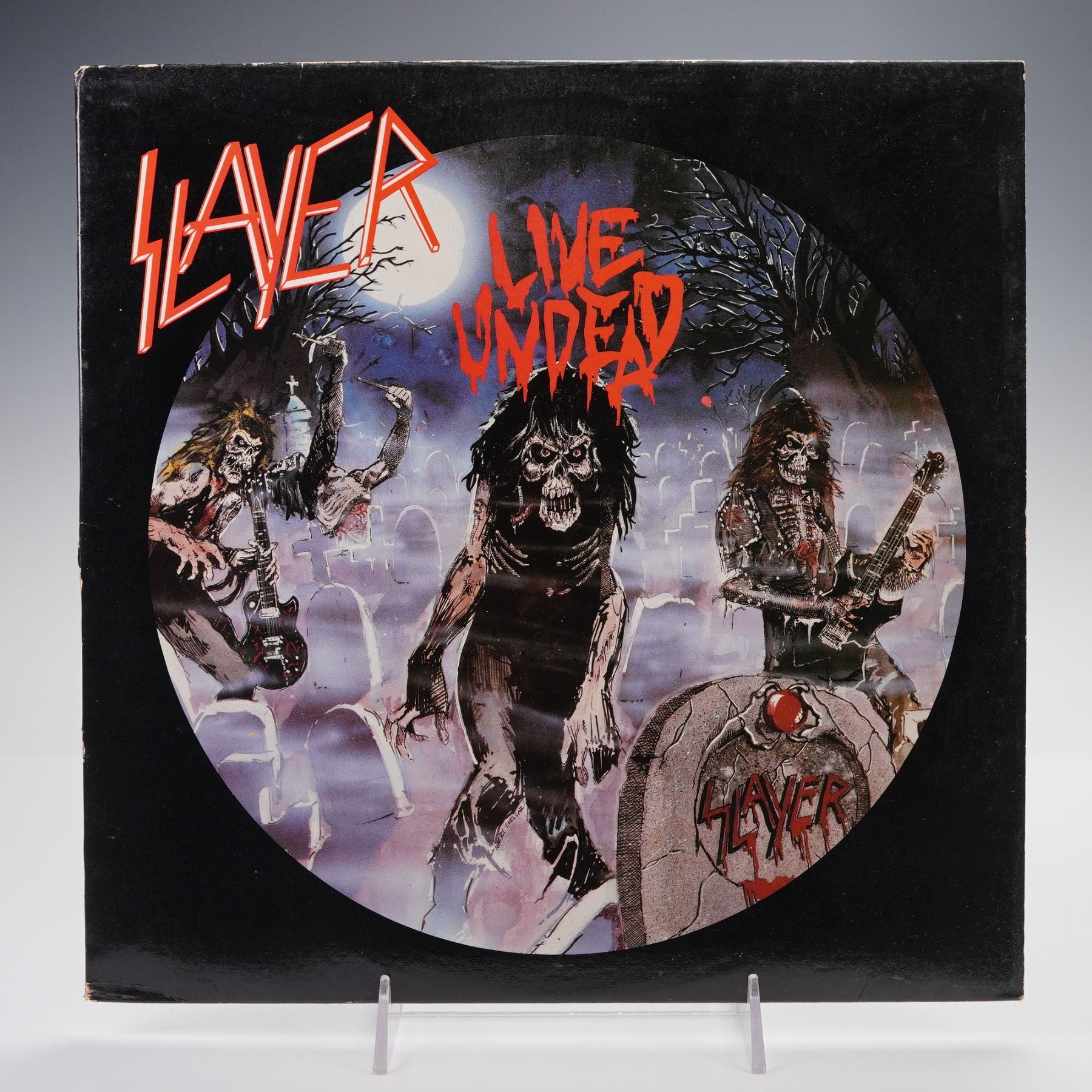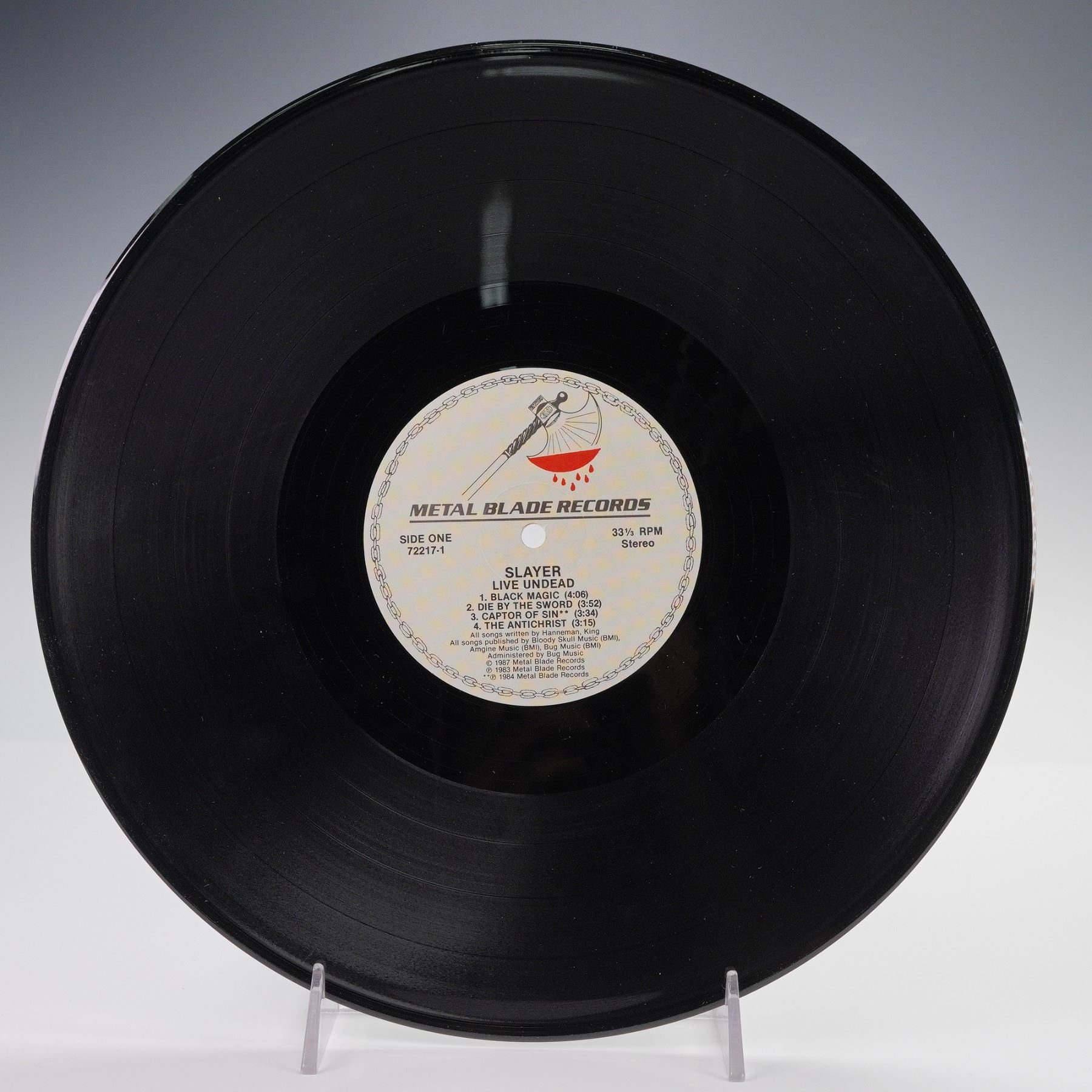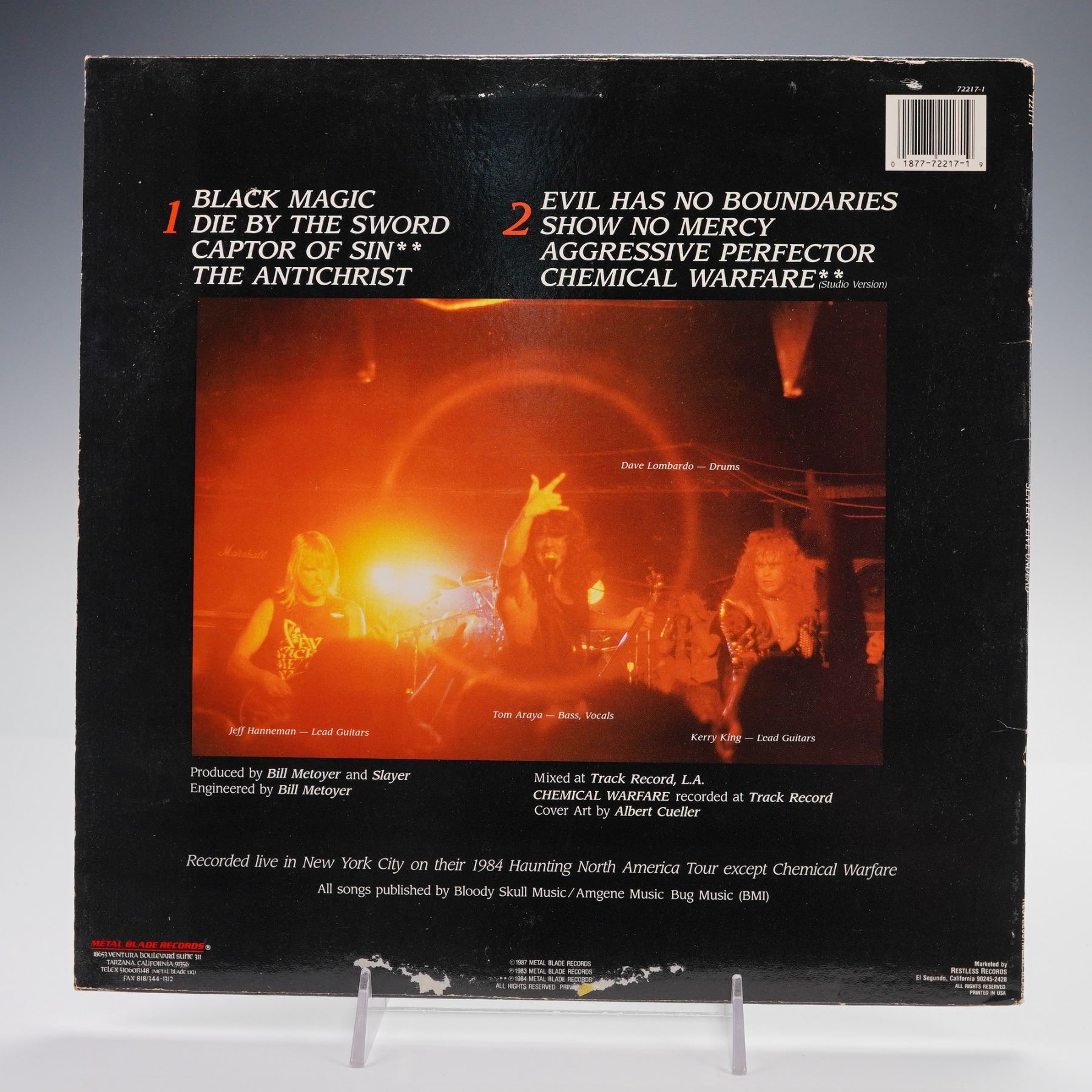 A first pressing of Slayer's 1984 live mini-album Live Undead. The record features a vivid image of zombified band members performing in a cemetery, with blood-dripping band logo and album title. The reverse jacket includes track listings for both sides and a live photograph of the band with individual credits. Side One includes "Black Magic," "Die by the Sword," "Captor of Sin," and "The Antichrist," while Side Two features "Evil Has No Boundaries," "Show No Mercy," "Aggressive Perfector," and "Chemical Warfare" (studio version). Recorded live in New York City during their 1984 Haunting North America tour. Cover art by Albert Cueller.