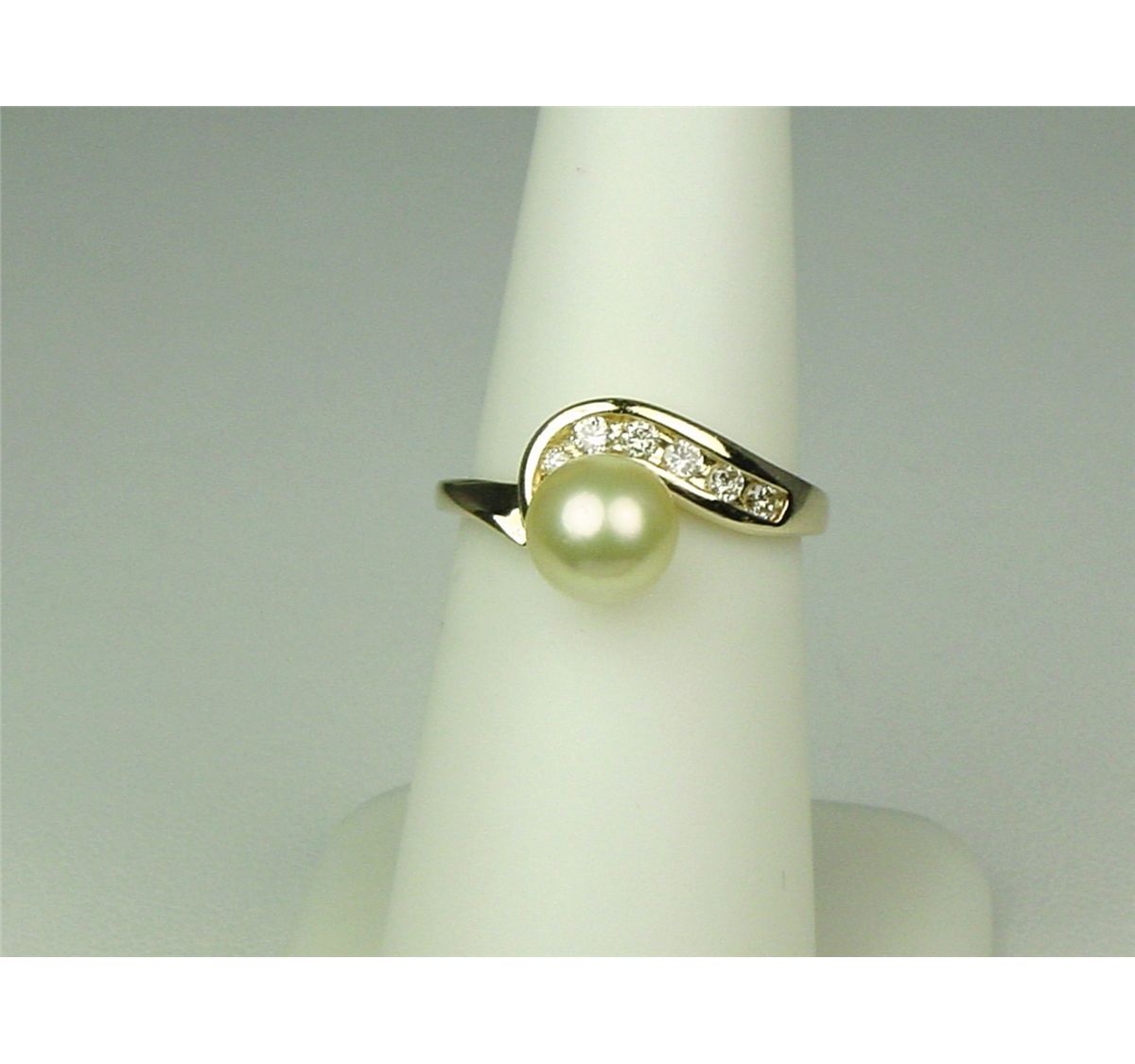 Set with a center round cultured pearl averaging 7.00mm in diameter and 6 channel diamonds weighing approx 0.10 carats of G-H colors and VS clarity. Retails $995.00