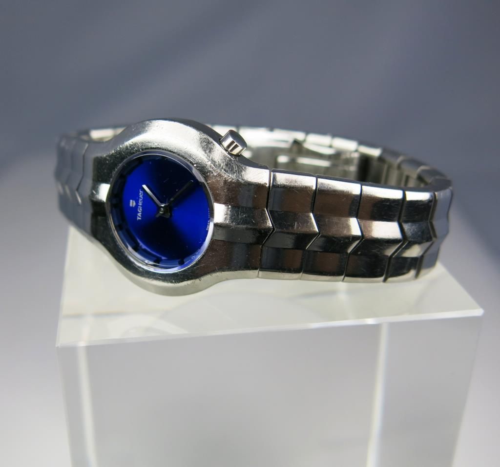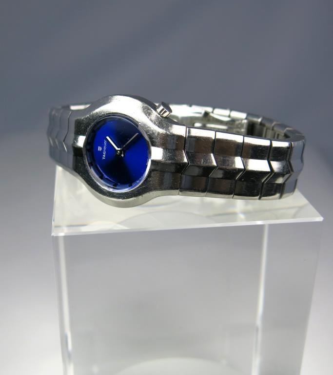Sleek ladies Stainless steel TAG Swiss made watch with lapis color dial and sapphire crystal. Estimate $600-$900