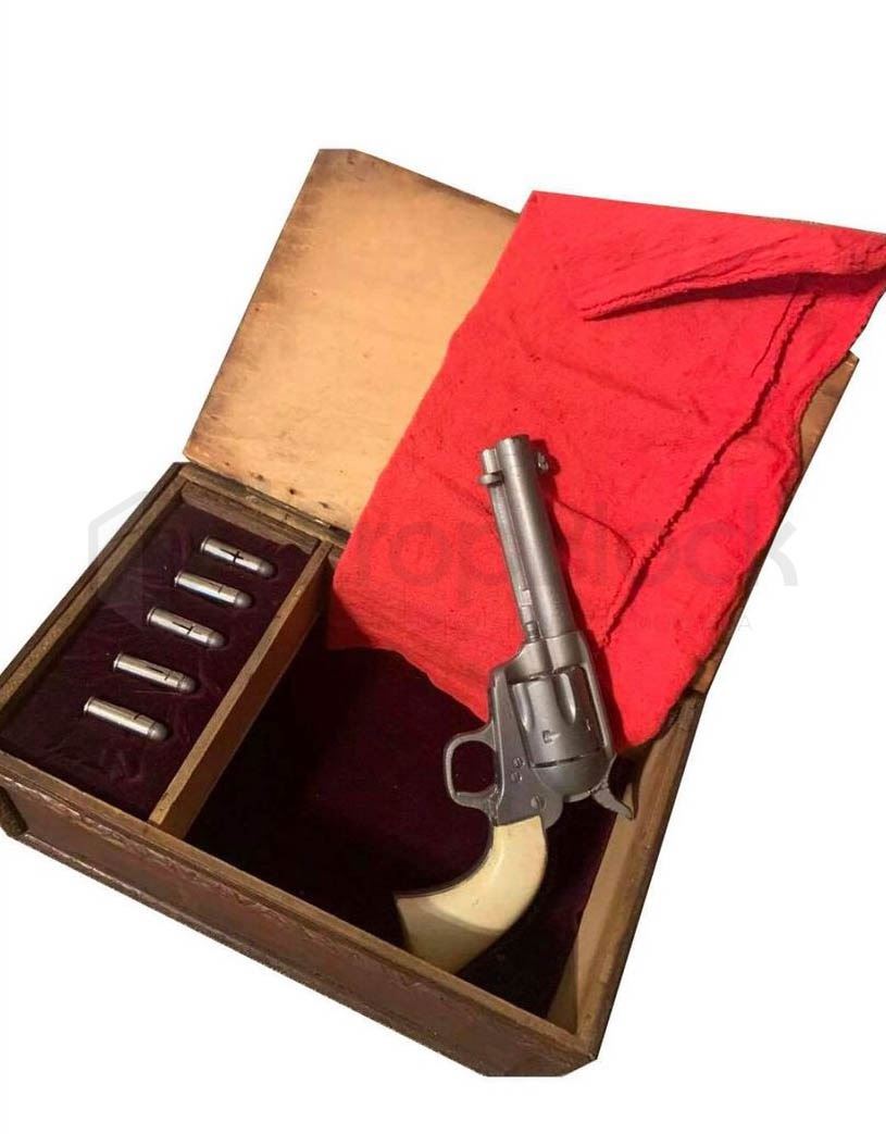 Serpent Tear Pistol with bullets and case use din the produciton of the television horror series Sleepy Hollow. Ichabod Crane is resurrected and pulled two and a half centuries through time to unravel a mystery that dates all the way back to the founding fathers. This is a rubber casting of a single action cartridge revolver with silver body and white handle. Included is a real wooden box featuring red velvet lining, a red rag to hold the pistol and five silver bullets featuring a carved in cross detail. This set remains in excellent, produciton used conditon.
