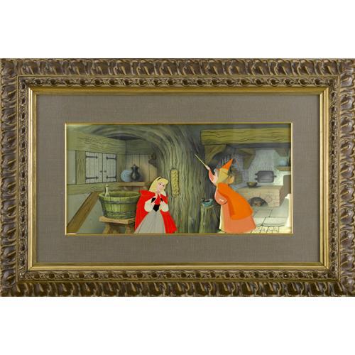 <B>Sleeping Beauty "Briar Rose and Flora" Animation Production Cels with Eyvind Earle Painted Background Original Art (Walt Disney, 1959).</B></I> The timeless tale of Sleeping Beauty was magically transformed into what many consider the last truly great animated feature film by the Walt Disney Studio, in 1959. Nothing was spared to make this lovely story come to life, and Disney utilized the best talents in the world to achieve the magnificently realized finished film. In this remarkable panoramic background and character cel presentation, Good Fairy Flora waves her magic wand over the beautiful Princess, in her disguise as Briar Rose. The incredibly detailed cottage interior background illustration has been signed in the lower corner by renown artist Eyvind Earle (1916-2000). The character cels have been meticulously trimmed and mounted onto a large layer of acetate, and the entire image area is a huge 25" x 12". The art has been professionally matted into an ornate frame, for an overall size of 38.25" x 26". The frame is lightly distressed and in Very Good condition, while the art is in Excellent condition.