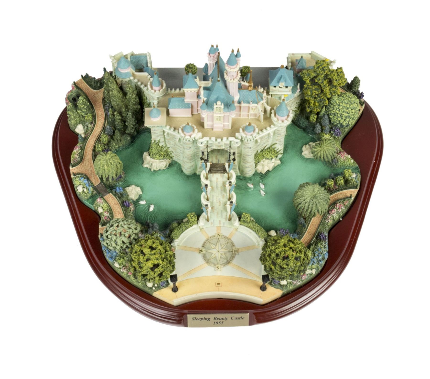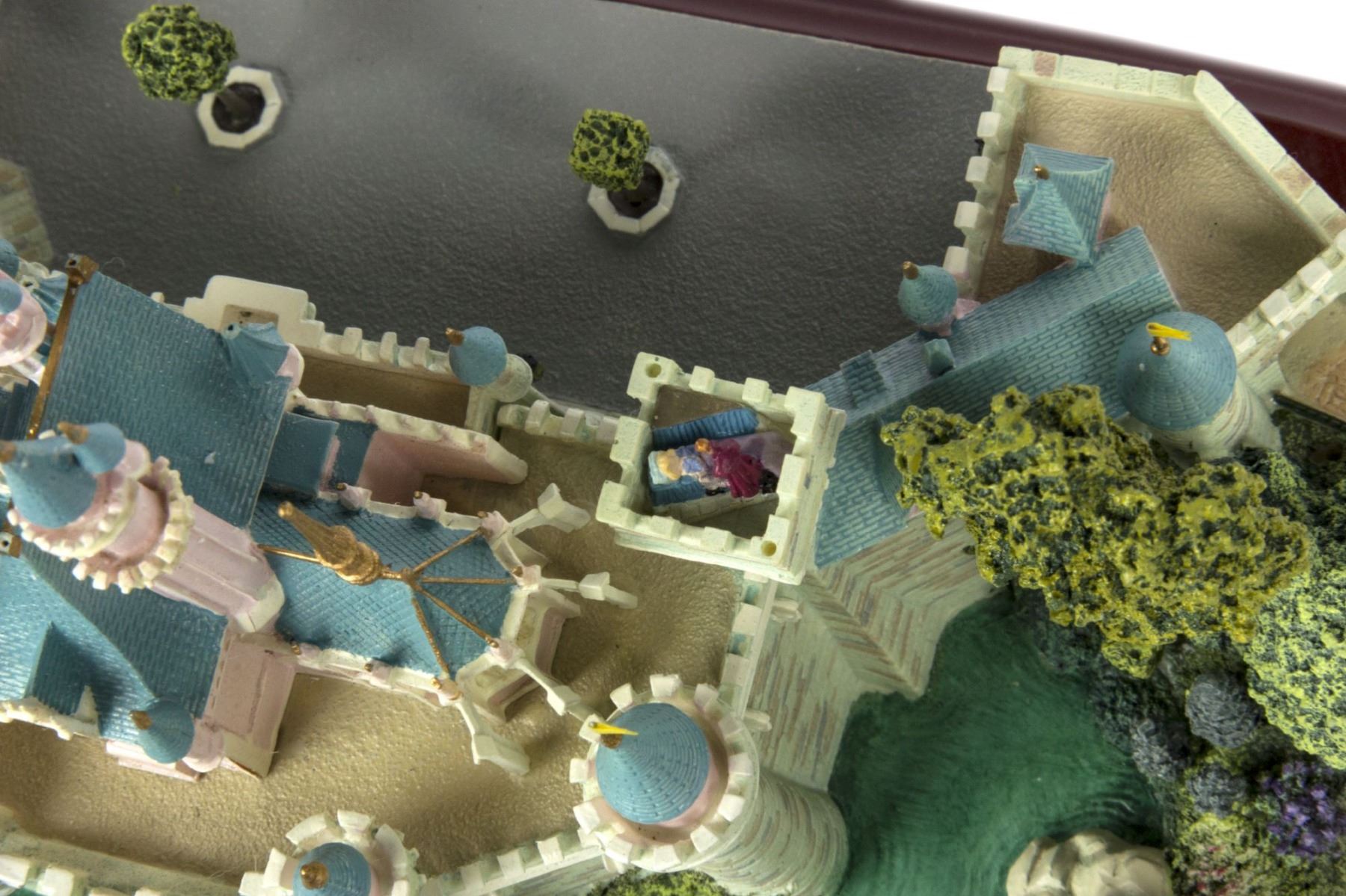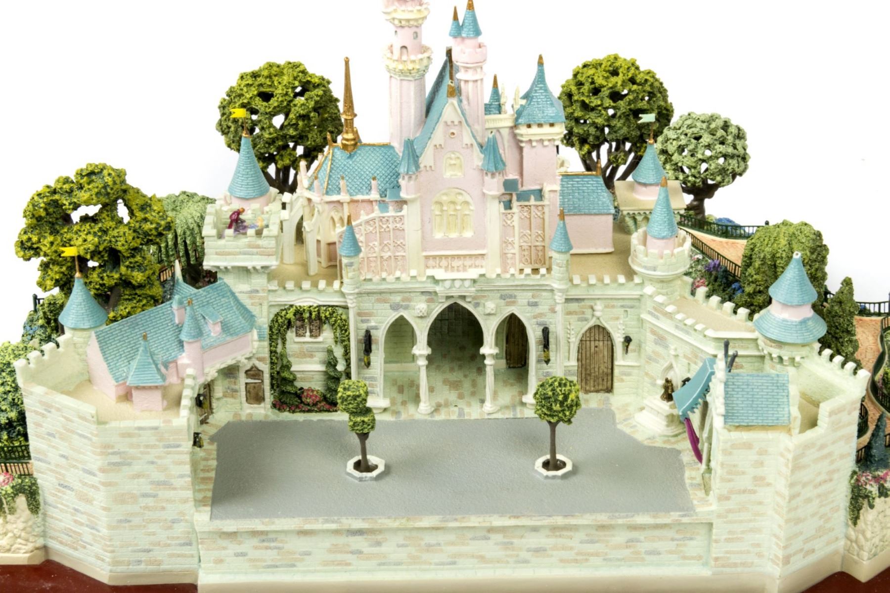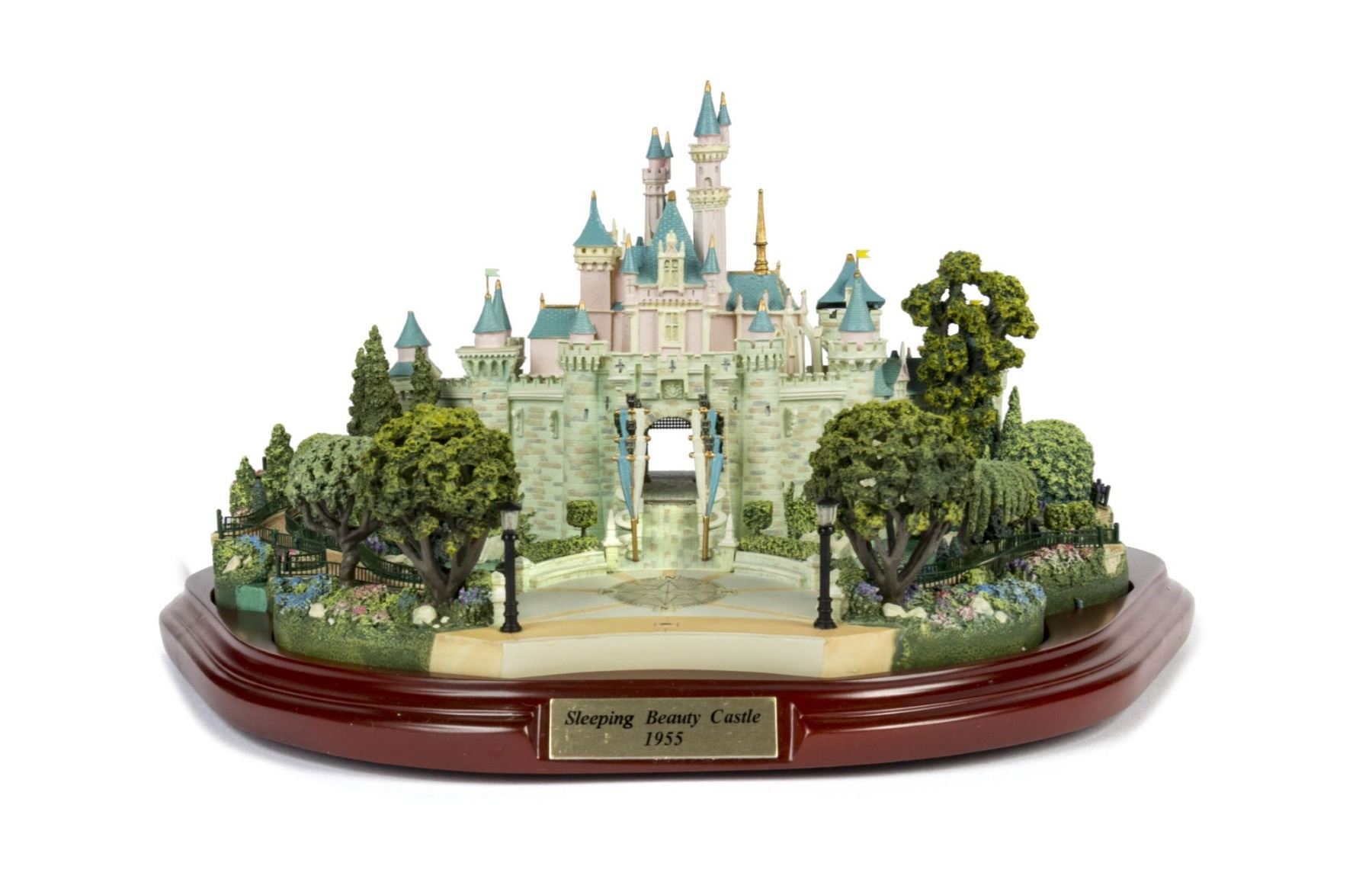 (Disney, 2002) An original first edition scale model of Sleeping Beauty Castle created by renowned miniaturist, Robert Olszewski. The Sleeping Beauty Castle model was the first piece designed by Olszewski for Disney's incredibly popular Main Street U.S.A. Collection of miniature models. Created in resin with a wood base and a brass plaque, the model measures 9"x10.75" and 6" tall. The condition is very good with minor wear from previous display. The original box is included. Given that these miniatures have numerous fine details, there may be a small chip, crack, or break that may have gone unnoticed. Please use the images of the item to help assess the full condition.