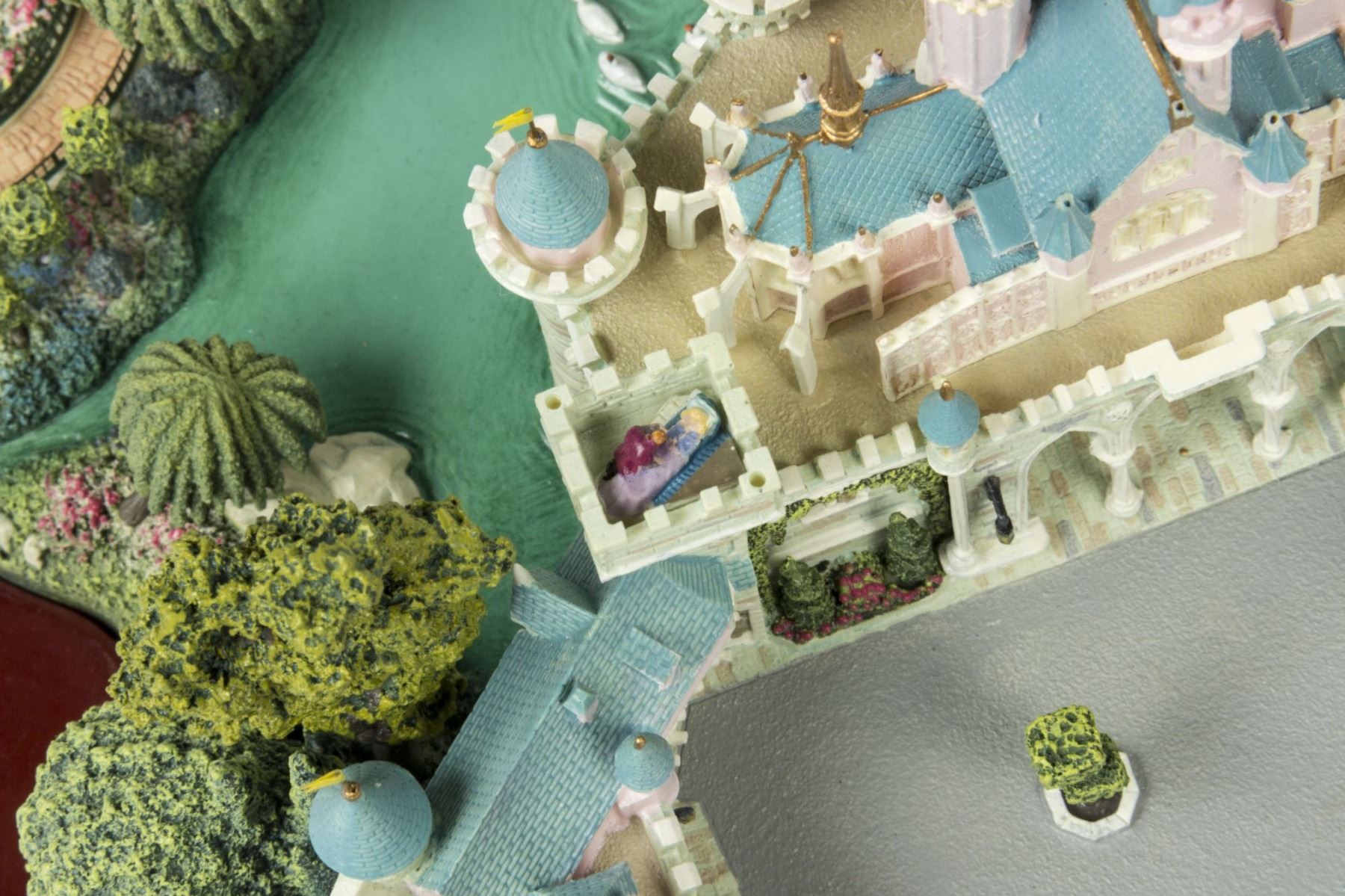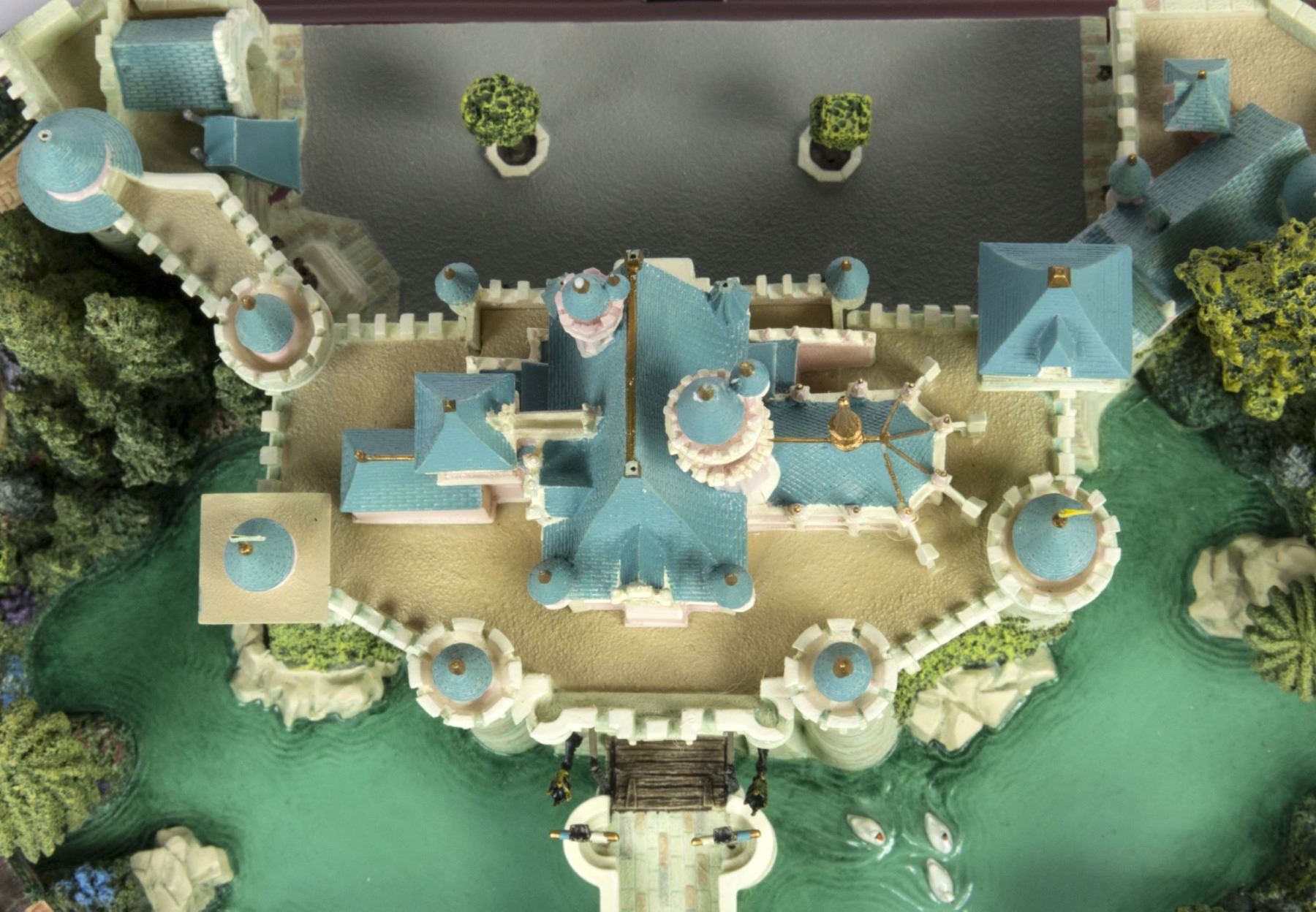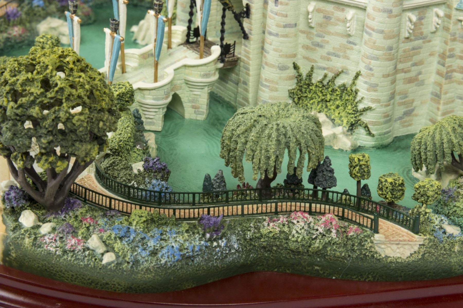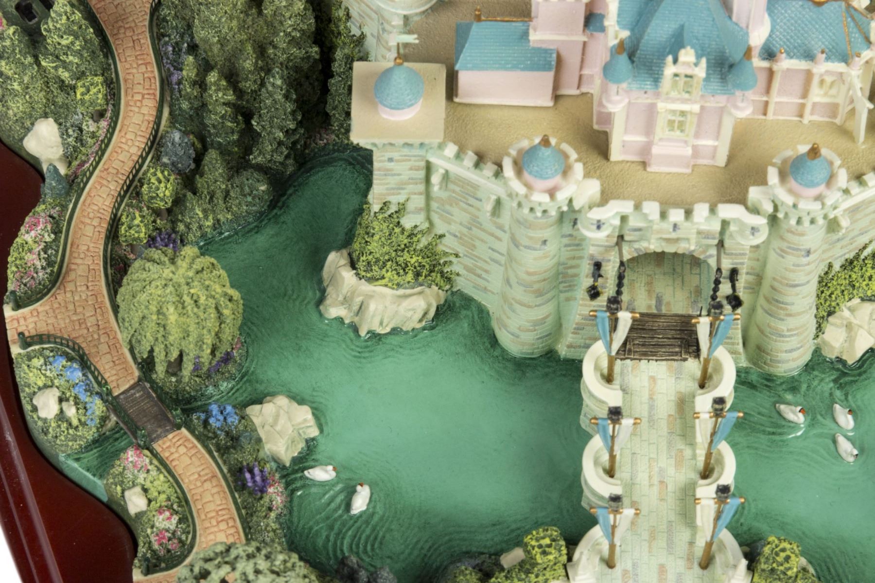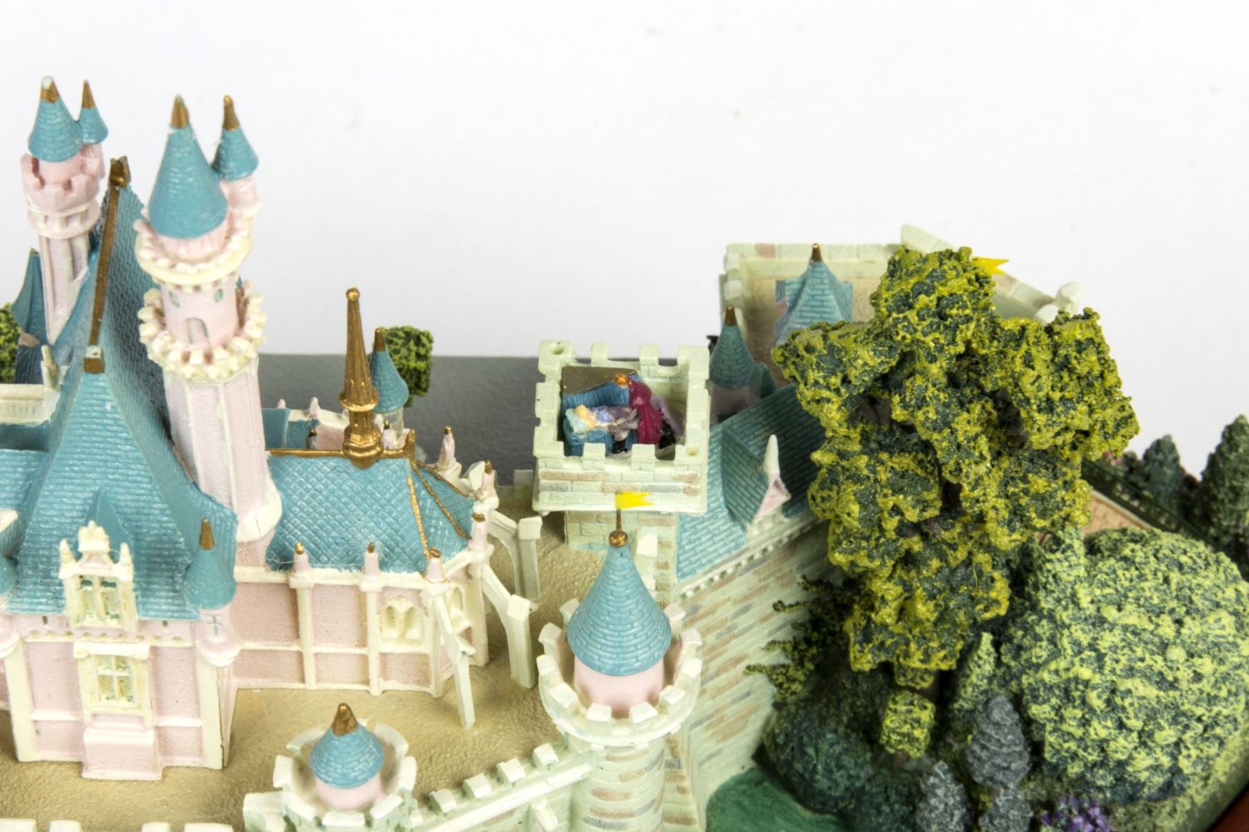 (Disney, 2002) An original first edition scale model of Sleeping Beauty Castle created by renowned miniaturist, Robert Olszewski. The Sleeping Beauty Castle model was the first piece designed by Olszewski for Disney's incredibly popular Main Street U.S.A. Collection of miniature models. Created in resin with a wood base and a brass plaque, the model measures 9"x10.75" and 6" tall. The condition is very good with minor wear from previous display. The original box is included. Given that these miniatures have numerous fine details, there may be a small chip, crack, or break that may have gone unnoticed. Please use the images of the item to help assess the full condition.