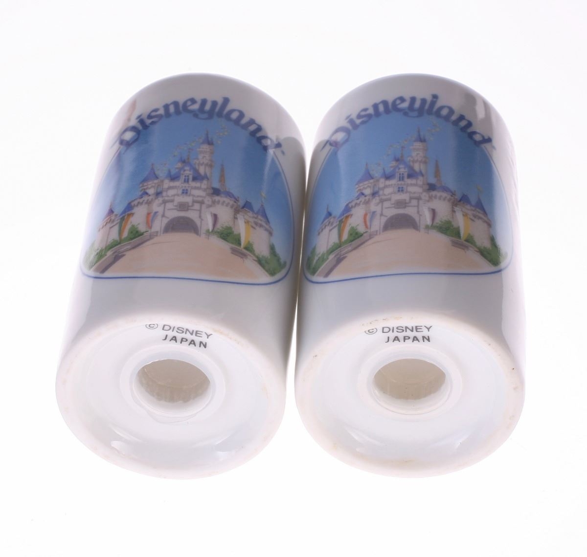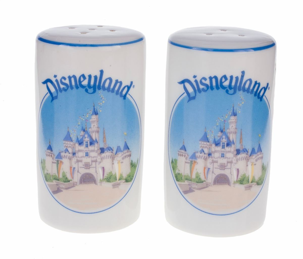 (Disneyland, 1960s) Salt and pepper shaker pair featuring imagery of Sleeping Beauty Castle. Measure 1.5" in diameter by 2.5" tall, each. In good condition.