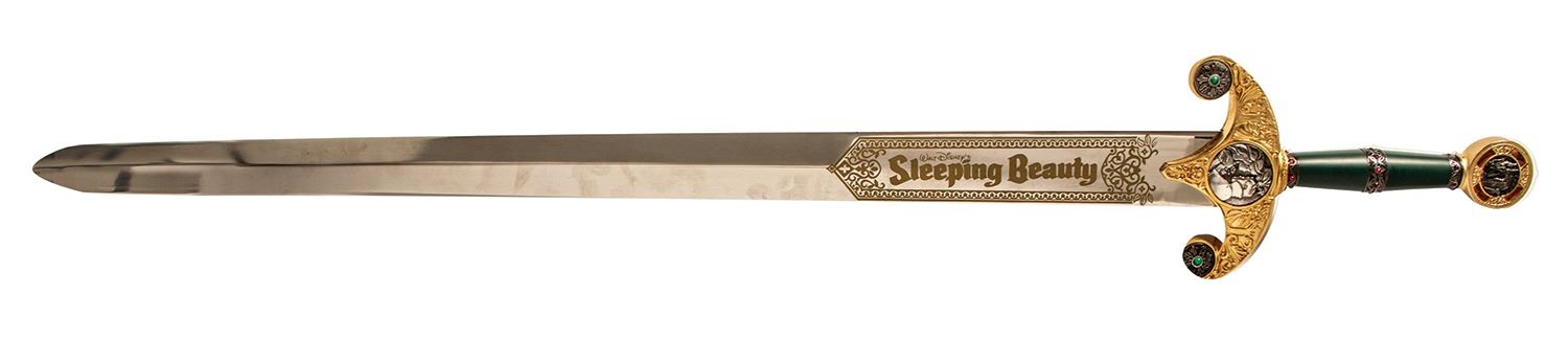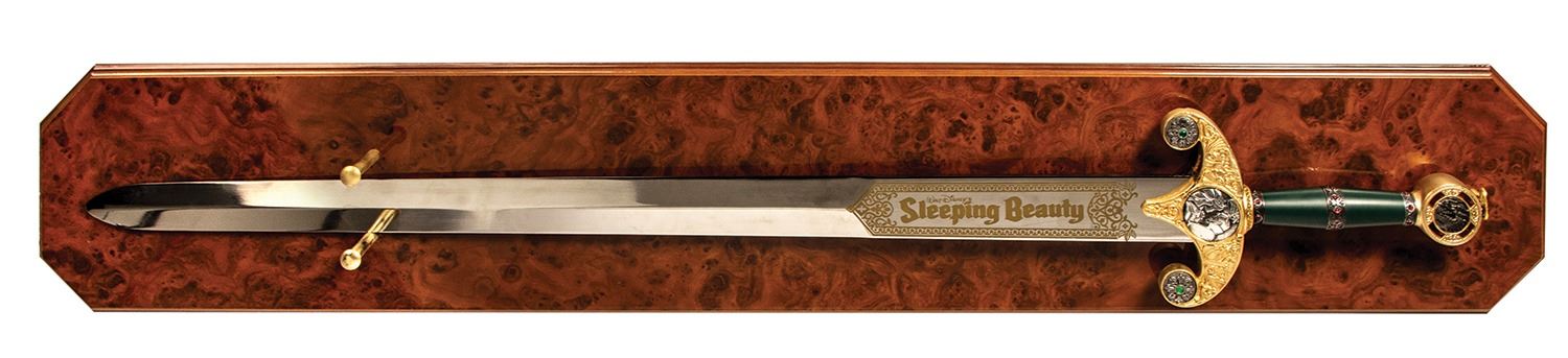 (Disney, c.2000s) A commemorative sword and holder, loosely inspired by the blade used to defeat Maleficent in the animated feature Sleeping Beauty. The stainless-steel blade is handmade by the Marto sword makers of Toledo, Spain, and the cross guard and grip feature 24-kt. gold-plated accents, silver-plated medallions, and 21 jewel-toned Swarovski crystals. The cross-guard features imagery of Sleeping Beauty with Prince Phillip, and also imagery of Maleficent’s dragon form on the grip. The sword measures 44"x6.25" and the display measures 49"x8.5". The items are in fine condition overall with some minor wear to the back of the display.