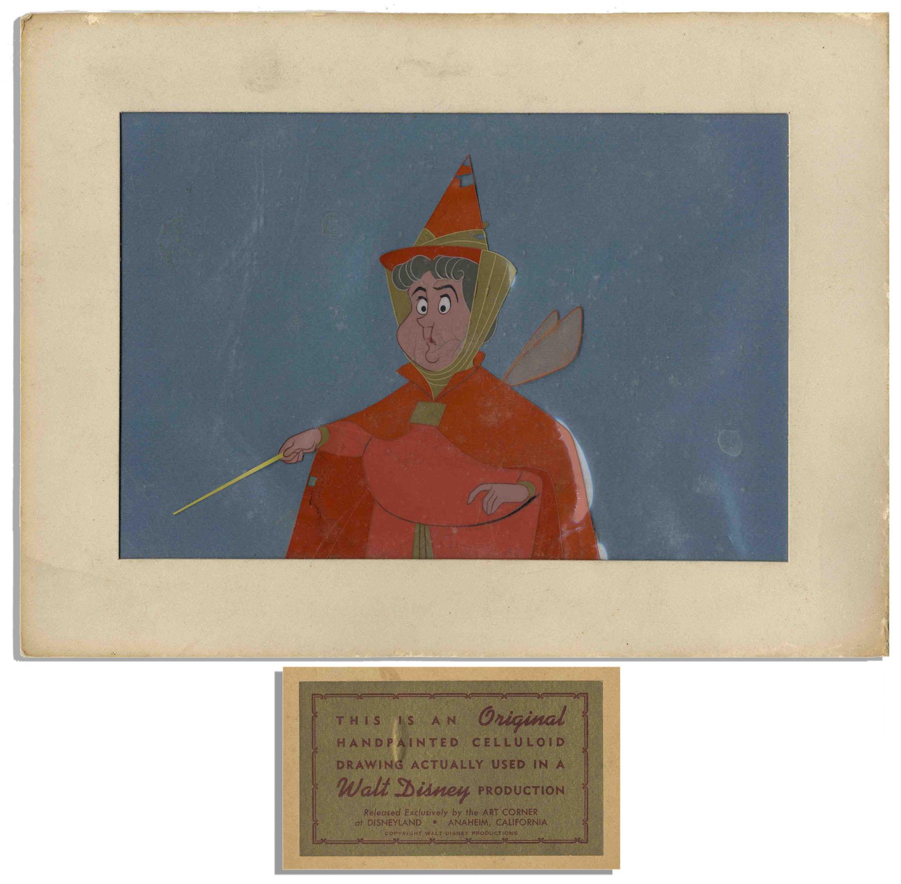 Rare Disney celluloid from the 1959 animated masterpiece ''Sleeping Beauty.'' Brightly colored cell depicts Flora, the red fairy in the film. Certificate sticker on verso reads: ''This is an original hand painted celluloid drawing actually used in a Walt Disney production released exclusively by the Art Corner of Disneyland…'' Cel measures 9.25'' x 6'' and is matted to an overall size of 12'' x 9''. Very delicate from age, with cracking on Flora's face and flaking on her hat and cape, else very good condition.
