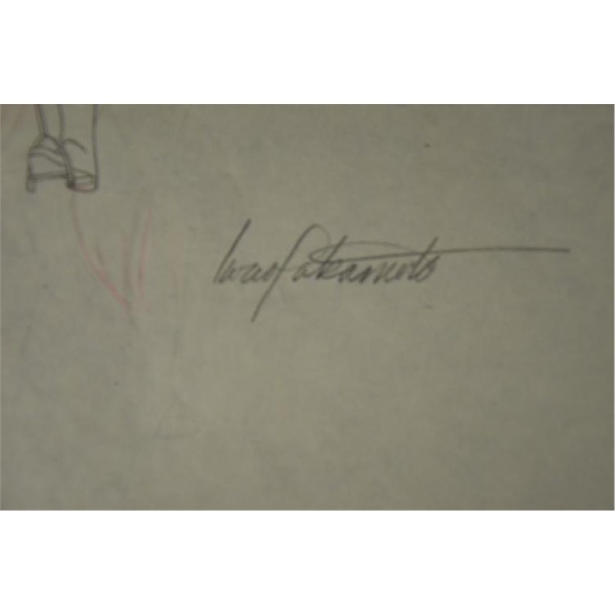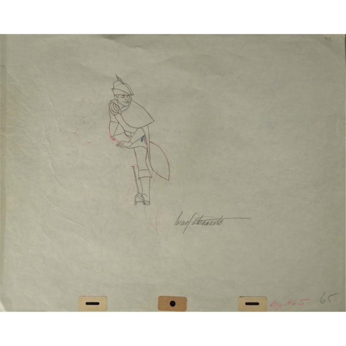 Here is an original animation drawing used in the production of the 1959 Disney movie Sleeping Beauty. This scene shows Prince Phillip on his horse. The horse has been erased, probably as its pose was altered. This drawing is especially nice because it is signed by the animator. * Animator: Iwao TakamotoMedium: Black and red pencil on animation paper Sheet size: 12 1/2 x 15 1/2 inchesDetails: Animator notations, lower rightCondition: Very good, with light wear around the edges