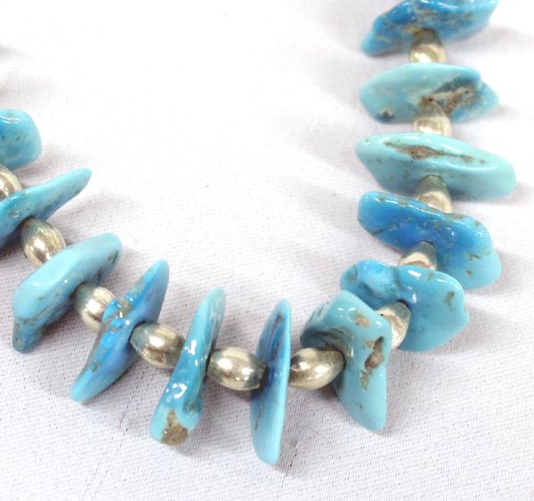 Sleeping Beauty Flat Turquoise Nugget Necklace. Beautiful graduated flat polished nuggets with sterling silver melon beads as spacers. The necklace measures 21'' with the largest stone measuring 1''. Handsome piece.