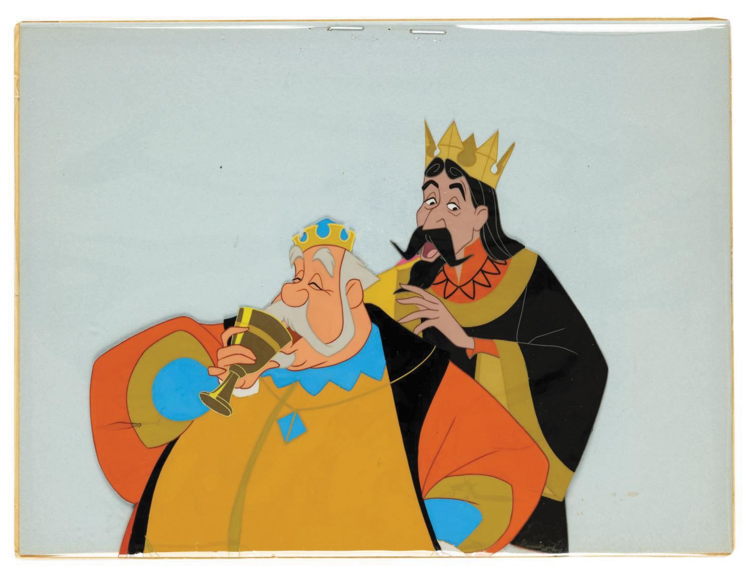 (Disney, 1959) A production cel set-up of King Hubert and King Stefan from Sleeping beauty. In this sequence, taken from the "Skumps" drinking song, the two monarchs prepare a musical toast for their betrothed children and soon to be united kingdoms. The set-up is composed of two cel layers trimmed and assembled for sale at the Disneyland Art Corner. It has a combined painted image size of 6.25"x6.5" on their 7.5"x10" cel sheets. The piece displays in very good condition, exhibiting minor wear and slight buckling. The Art Corner label is retained on the reverse.