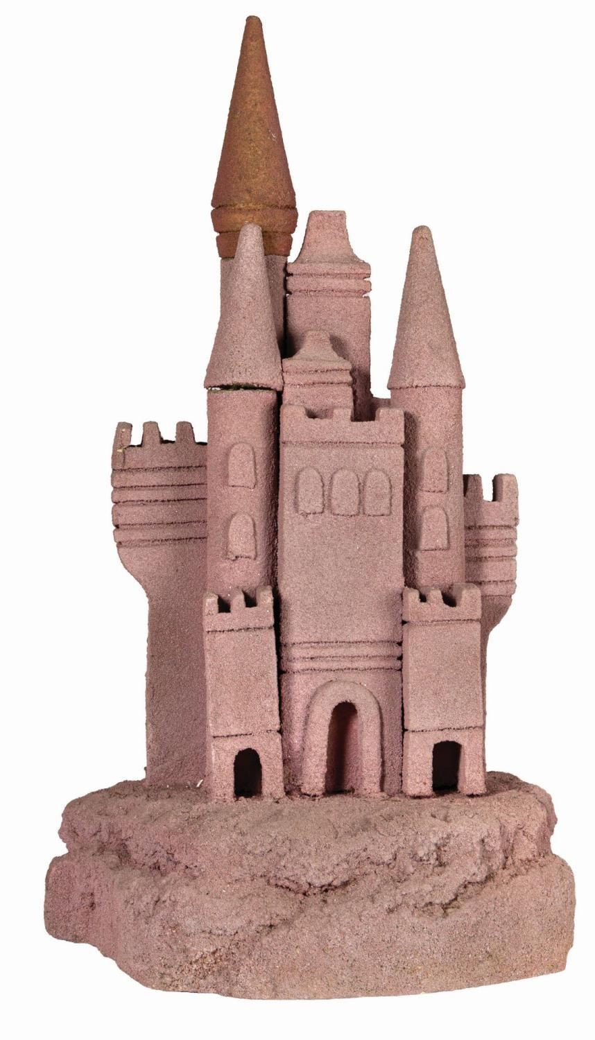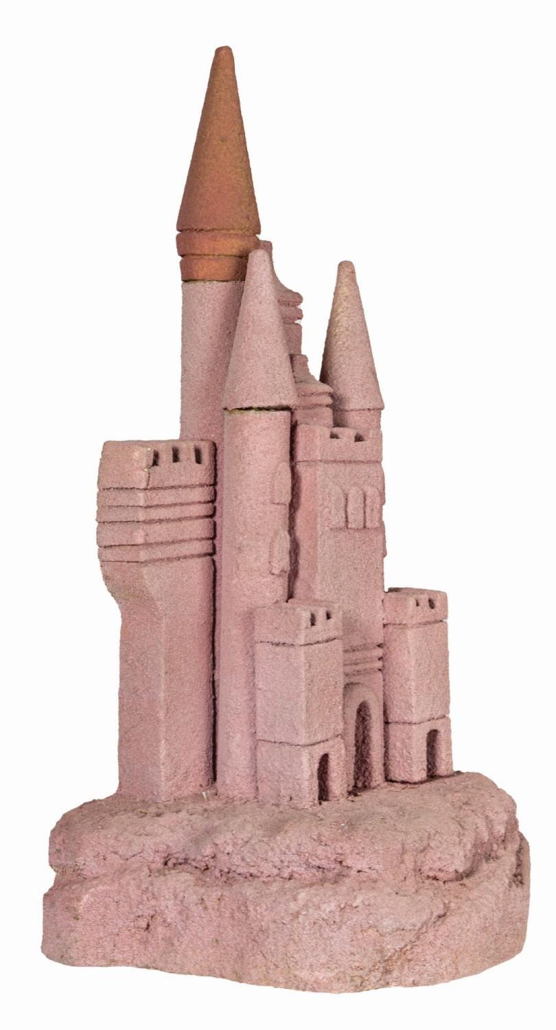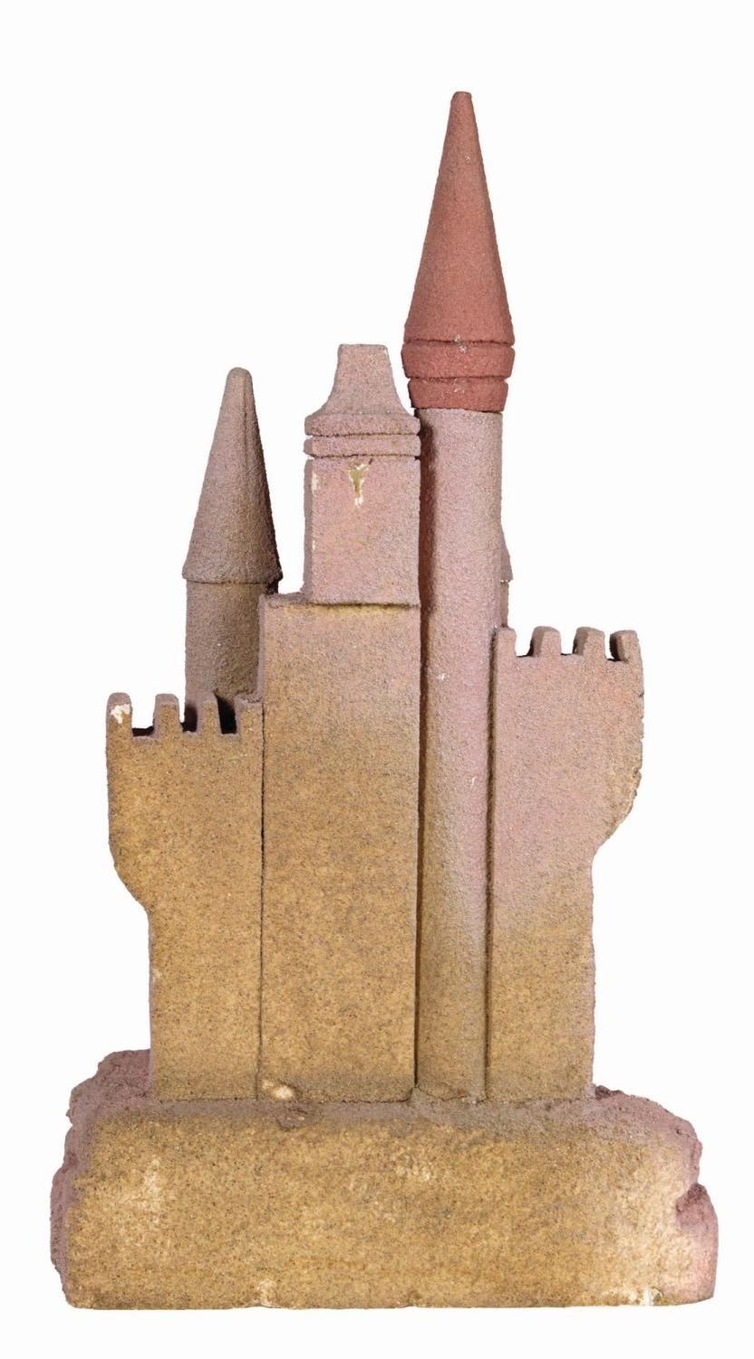 (Disneyland, 1980s) A faux sandcastle inspired by Sleeping Beauty Castle displayed at Geppetto's Arts & Crafts in Disneyland's Fantasyland. The castle is constructed of carved styrofoam components that have been coated in sand, painted a whimsical rose pink, and assembled on a styrofoam base carved to look like craggy stone. Measuring 28.25"X15.25" and 11" deep, the piece is in very good condition with some spot surface loss and patches of paint loss to the reverse.