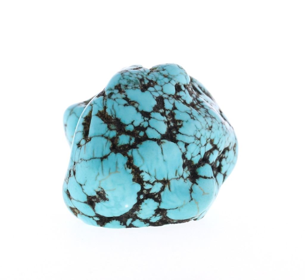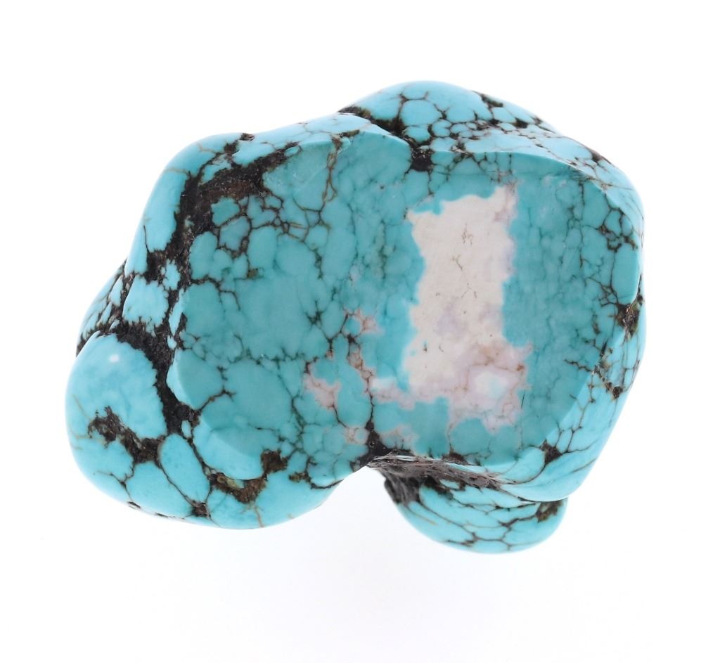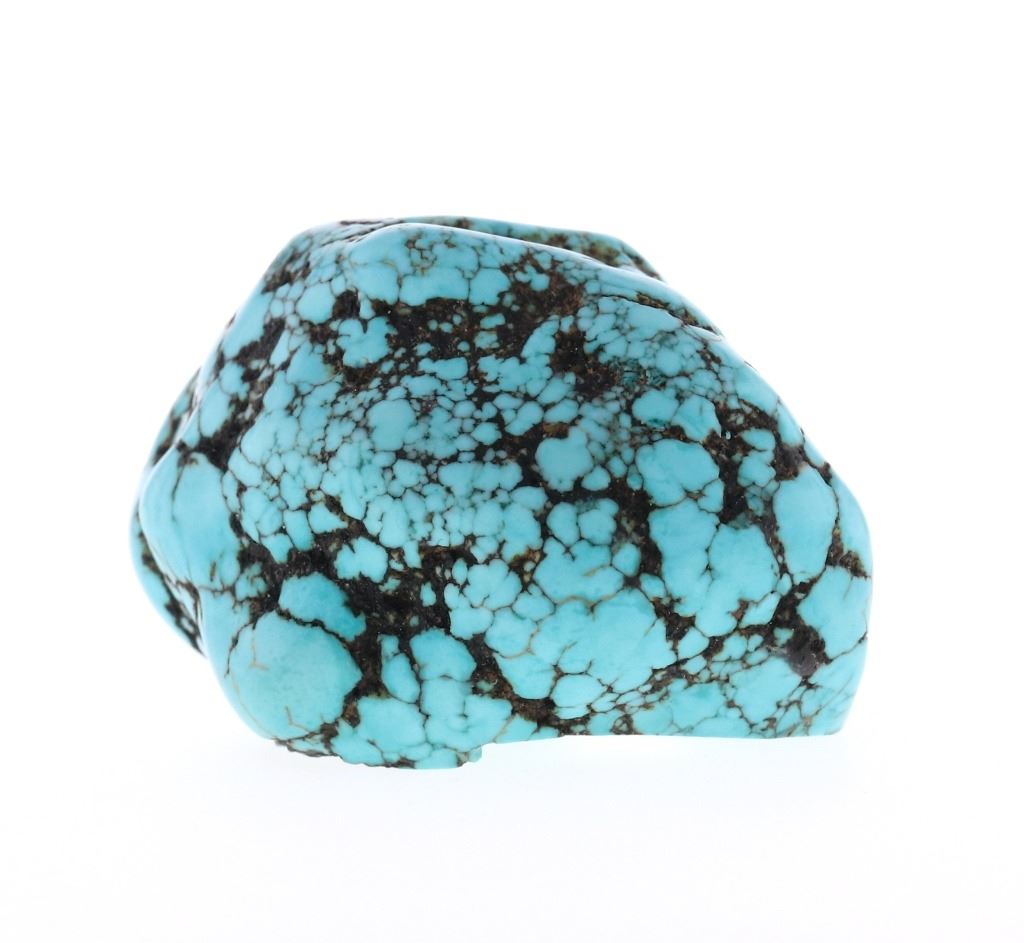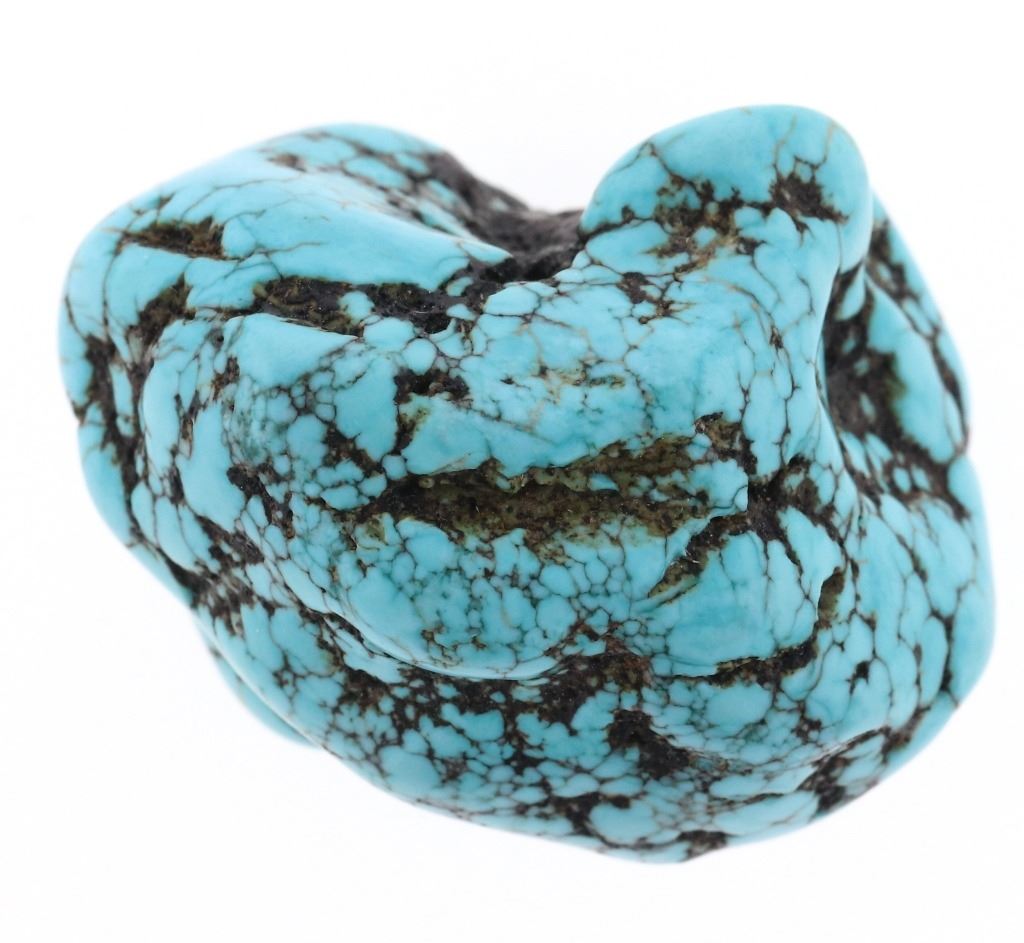 The lot features a large nugget cabochon of natural Turquoise from the Sleeping Beauty Mine in Globe, Arizona. The piece has been cut on one side and polished on the others. The stone was examined by a professional certified gemologists and found to be natural turquoise, the gemologist stated that the central white is likely the stone being impregnated with another mineral. The stone shows a nice blue coloring with spider web / spiderwebbing black matrix. Overall the piece is in good condition. Has a total weight of 268.5 carats and measures approximately 44.2mm x 29.0mm x 34.5mm.