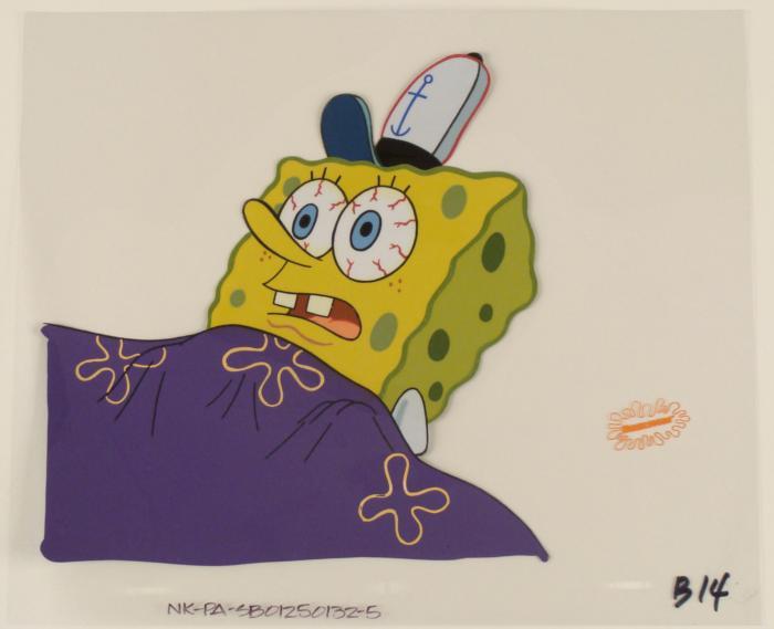 This original animation cel is from the Nickelodeon TV show SpongeBob Squarepants. The story takes place under the deep blue sea in Bikini Bottom, where SpongeBob resides. SpongeBob, who is a yellow, porous sponge, is your typical happy-go-lucky character, as he is always cheerful and enjoys making people laugh. Patrick Star, SpongeBob's neighbor who is a starfish, is your average children's show idiot, as he boasts knowing nothing and is often getting himself into ridiculous situations. Between the homes of these two lies the home of the miserable Squidward, a squid, who is known for being grouchy and playing tricks on SpongeBob and Patrick. Both SpongeBob and Squidward work at the Krusty Krab, a fast food business run by the greedy money-loving Mr. Krabs, a crab, the arch rival of the evil, possibly misunderstood, Plankton. Another neighbor, Sandy Cheeks, an athletic squirrel who normally wears an astronaut's space suit, was introduced in "Tea at the Treedome." She spends most of her time inventing and experimenting. Why is SpongeBob sleeping with his Krusty Krab hat on?Original Production Animated Cel Overall Size of Cel: 10 1/2" x 12 1/2" Very Good ConditionThis is an original hand-painted cel set-up used in the production of an episode of "SpongeBob SquarePants." Each one-of-a-kind set-up represents a slight change in position of the characters. When individually photographed and projected in rapid succession, the images appear to move.