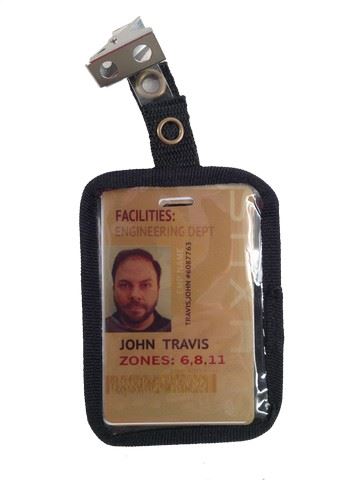 Screen used, 'Engineering Dept' plastic with metal clip I.D. tag with the name 'John Travis', featured prominently when Vincent (Jamie Foxx) incapacitates Travis with a knee to the groin and takes the tags to gain access in the Casino (3.5"x2").