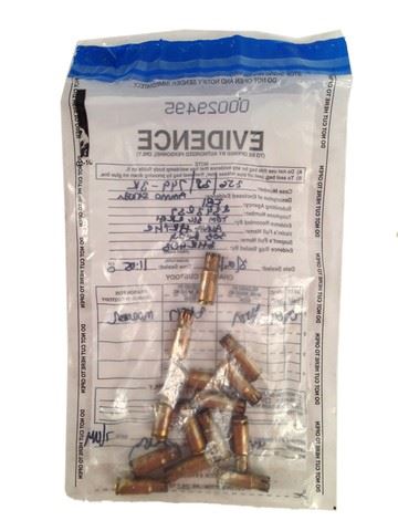 Sealed police 'Evidence' bag with 14 spent crime scene shell casings and hand written notes ( 10.5"x6").