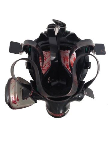 Garage henchman, production used bloody gas mask with bullet hole in front from the final gun battle in the Luxus Casino garage (11"x9"x7").