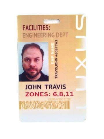 Screen used, 'Engineering Dept' plastic I.D. tag with the name 'John Travis', featured prominently when Vincent (Jamie Foxx) incapacitates Travis with a knee to the groin and takes the tags to gain access in the Casino (3.5"x2").